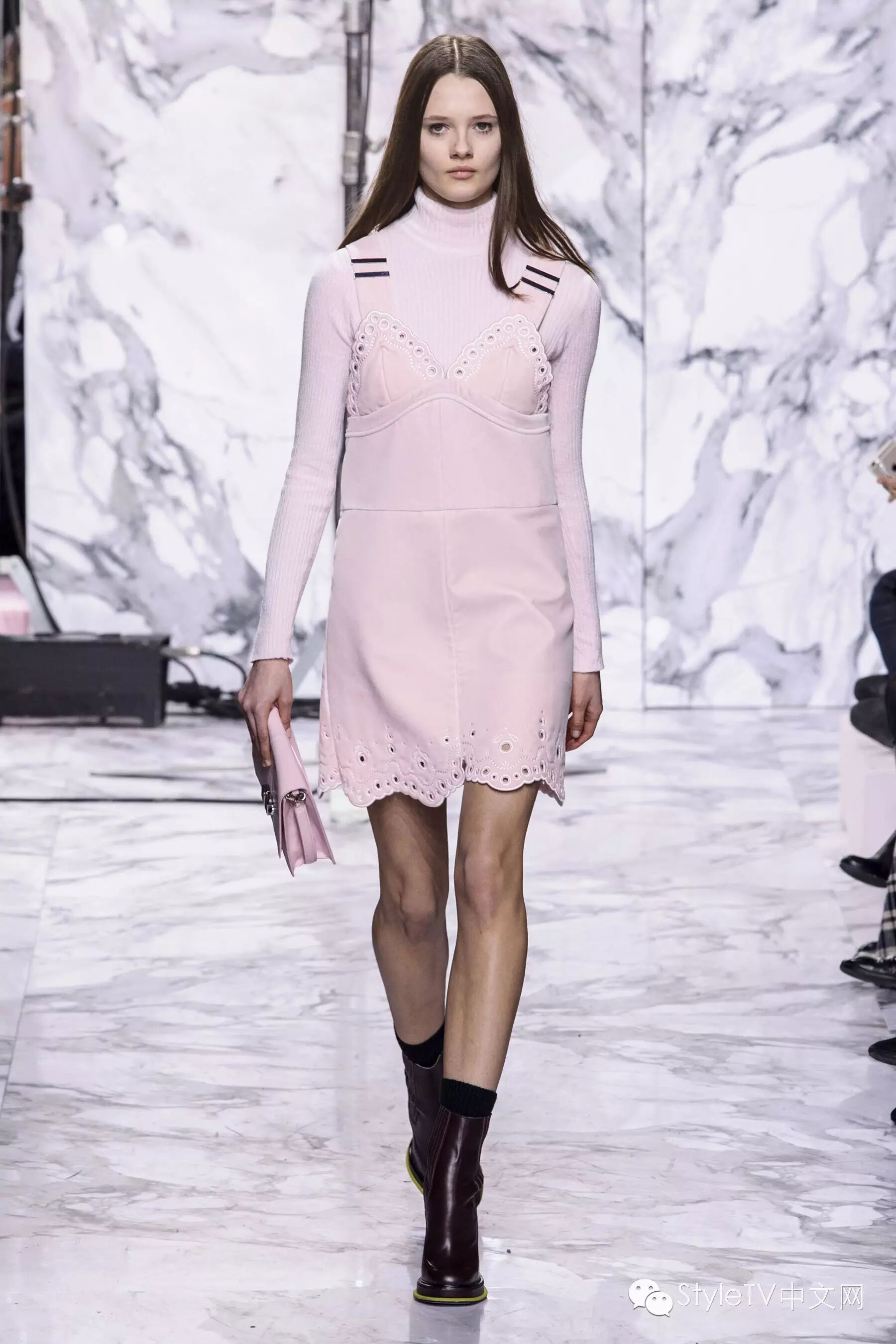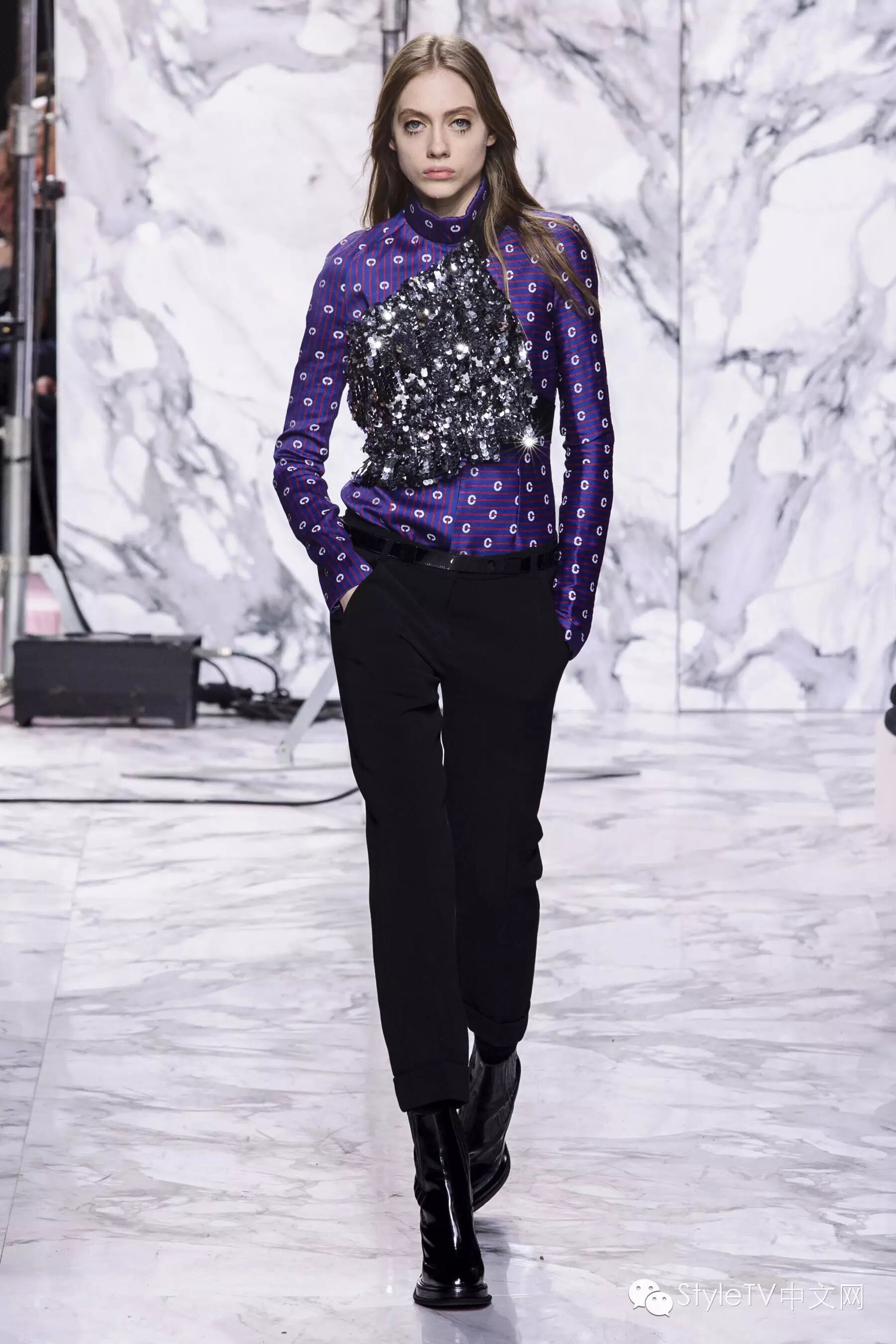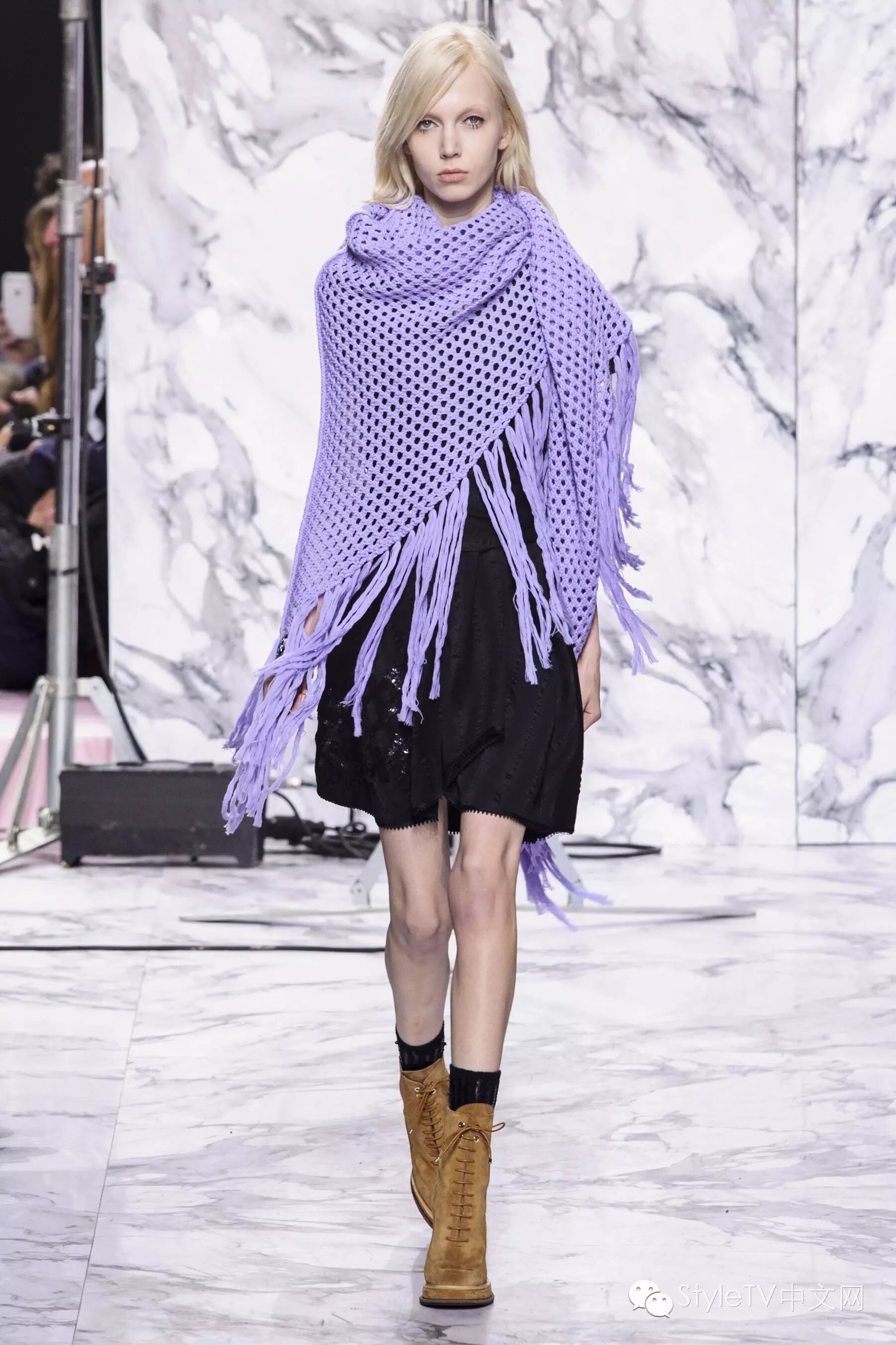 闪亮混色和亮片强化了服装的戏剧效果,尼泊尔式的印花搭配背带连衣裙,散发出摩登的异域气息。色彩逐渐从柔和棕色转变为灰色,黑色,淡紫色和粉色,并渐渐变得硬朗,但仍是甜美的女孩。
