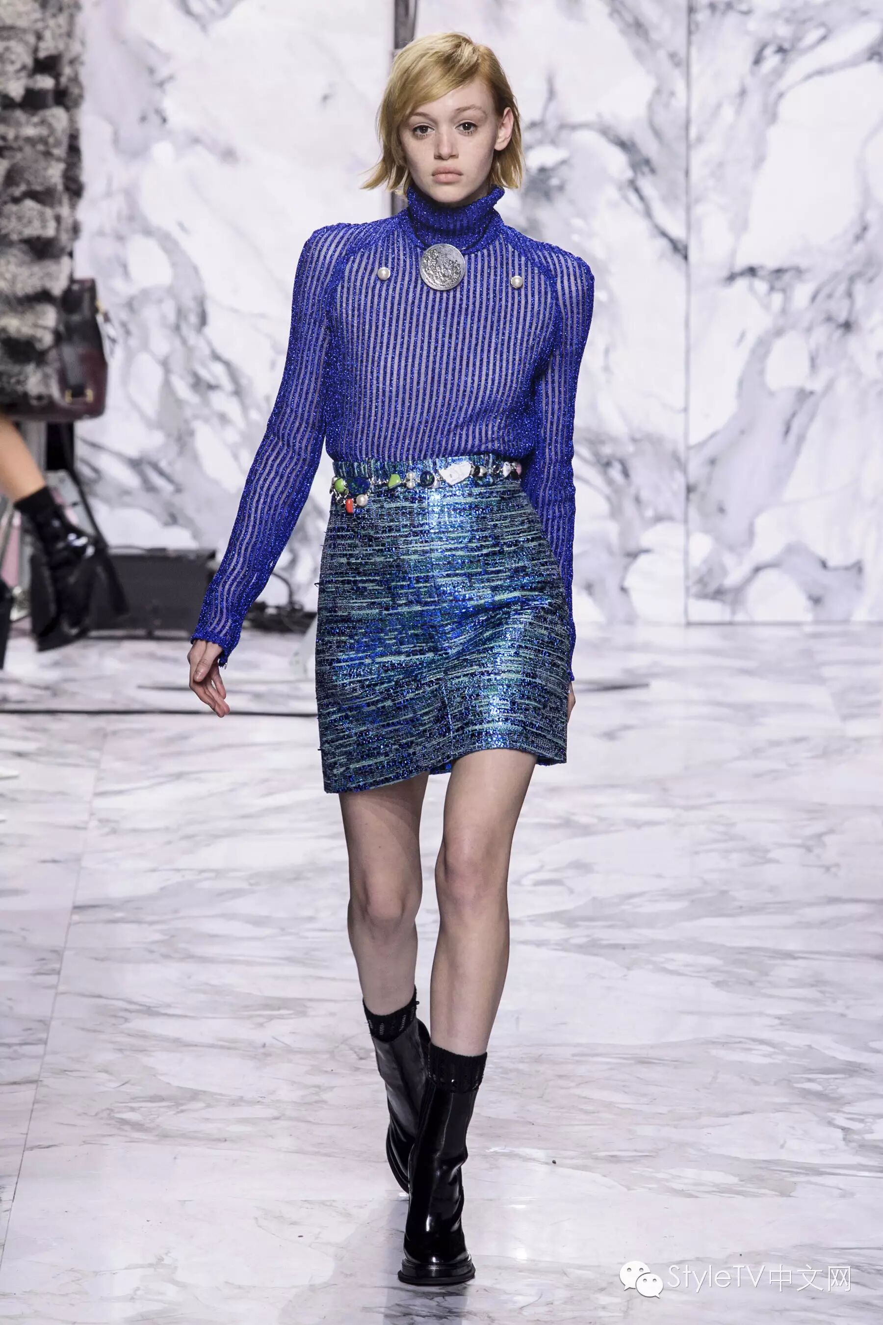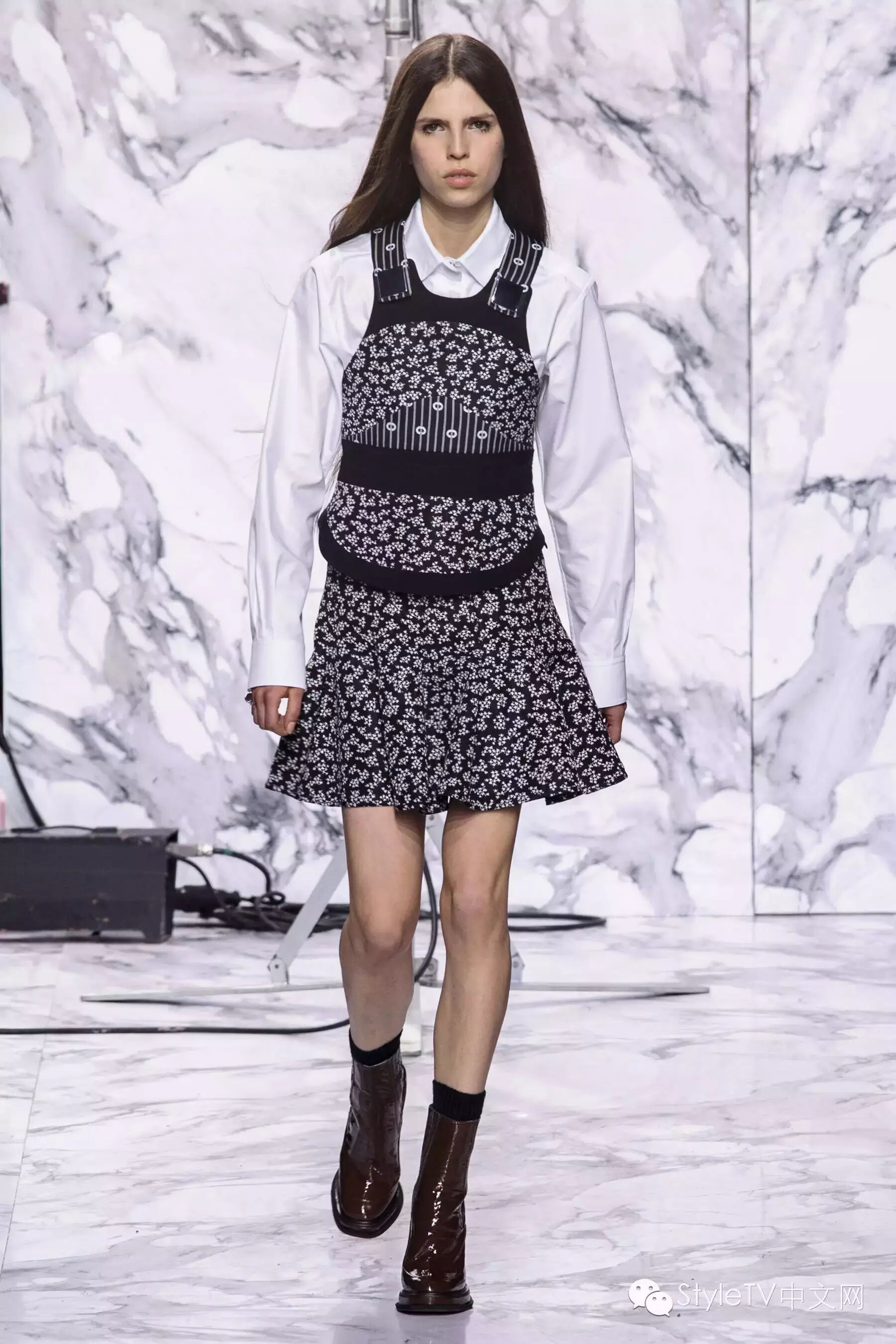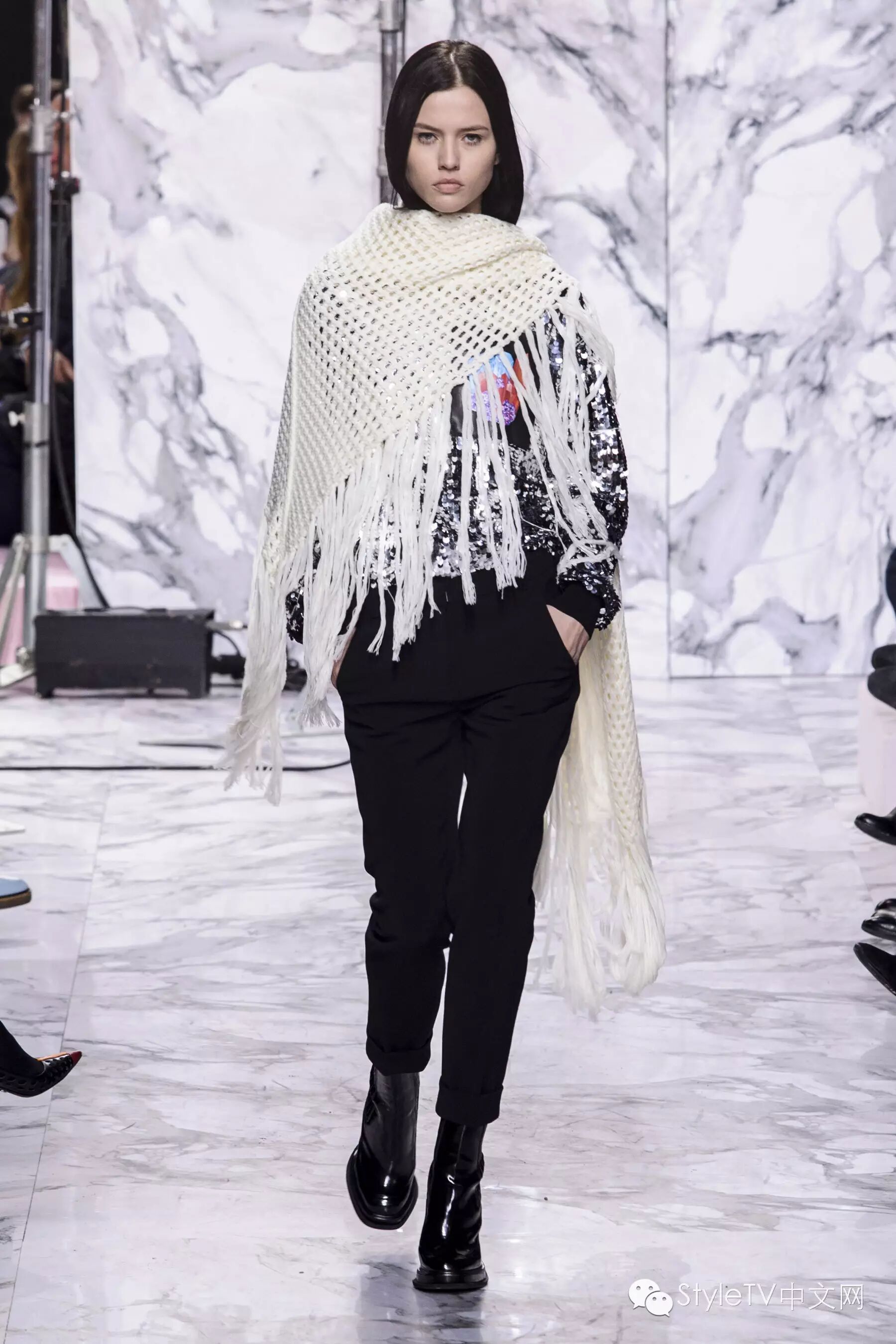 闪亮混色和亮片强化了服装的戏剧效果,尼泊尔式的印花搭配背带连衣裙,散发出摩登的异域气息。色彩逐渐从柔和棕色转变为灰色,黑色,淡紫色和粉色,并渐渐变得硬朗,但仍是甜美的女孩。