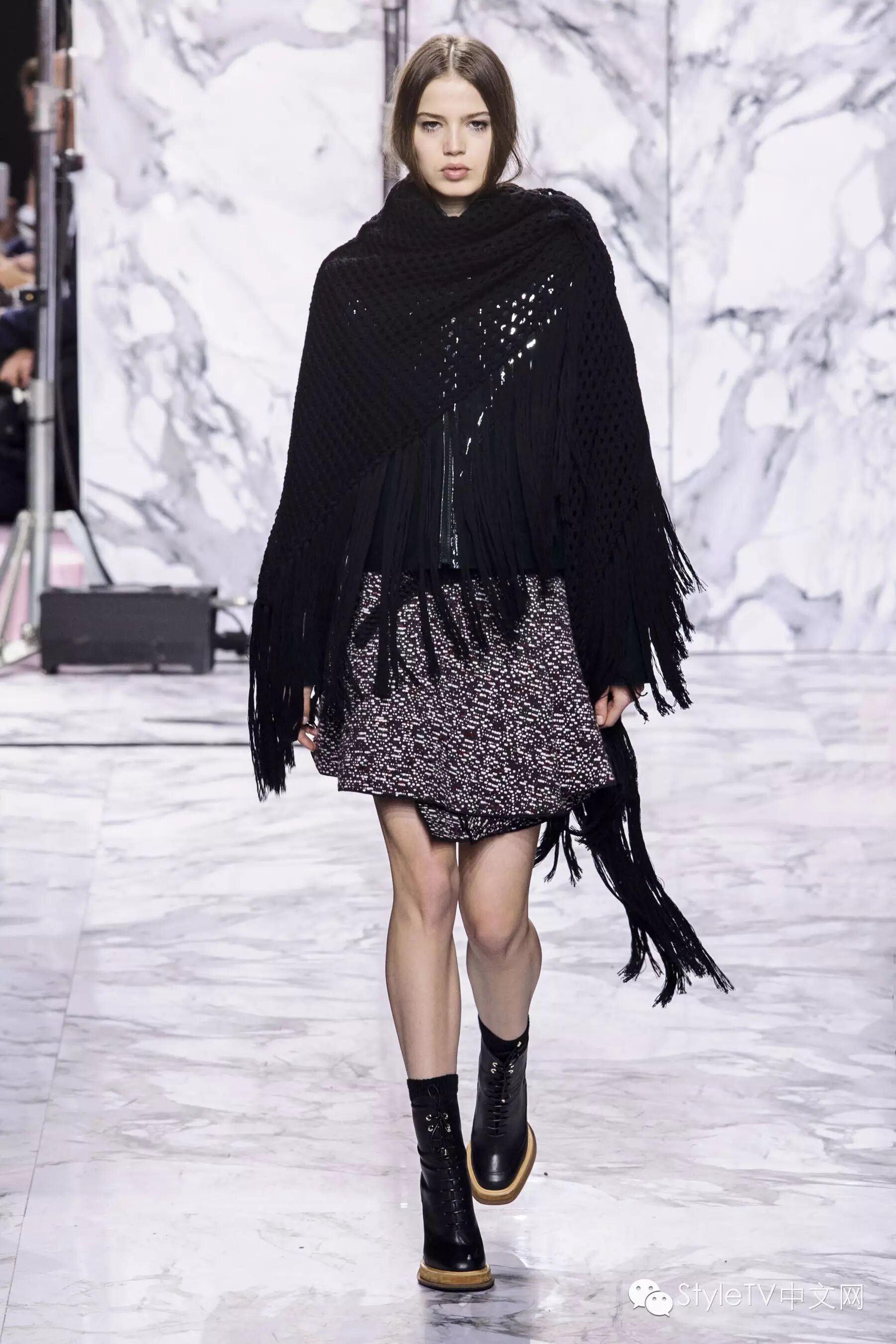 带有流苏边的网眼针织披肩成为异域风情的另一个象征性元素。无论是搭配短裙抑或是长裤,无不散发出飘逸感,足下的皮靴增添了一份率性美。廓型提花针织翻毛皮外套,搭配红色漆皮拉链夹克,是异域与城市风情的融合演绎。