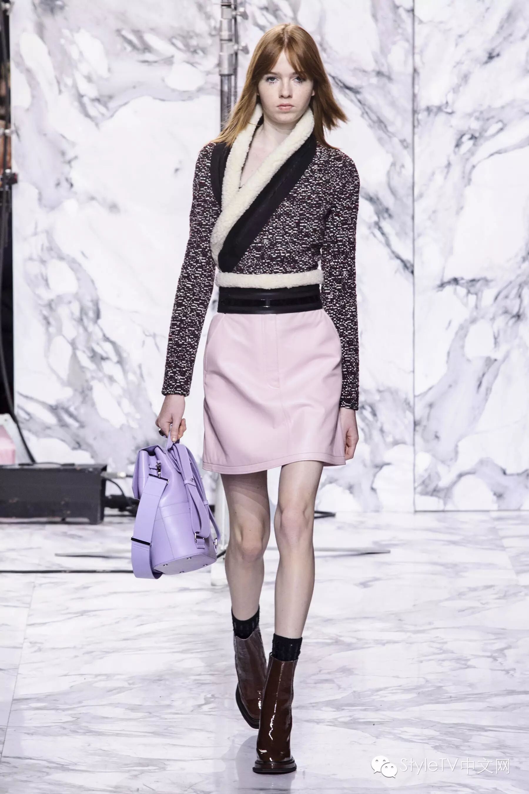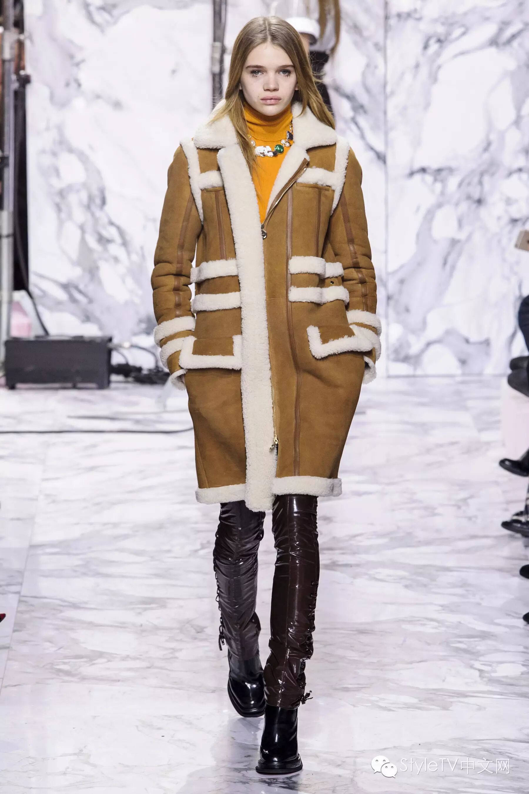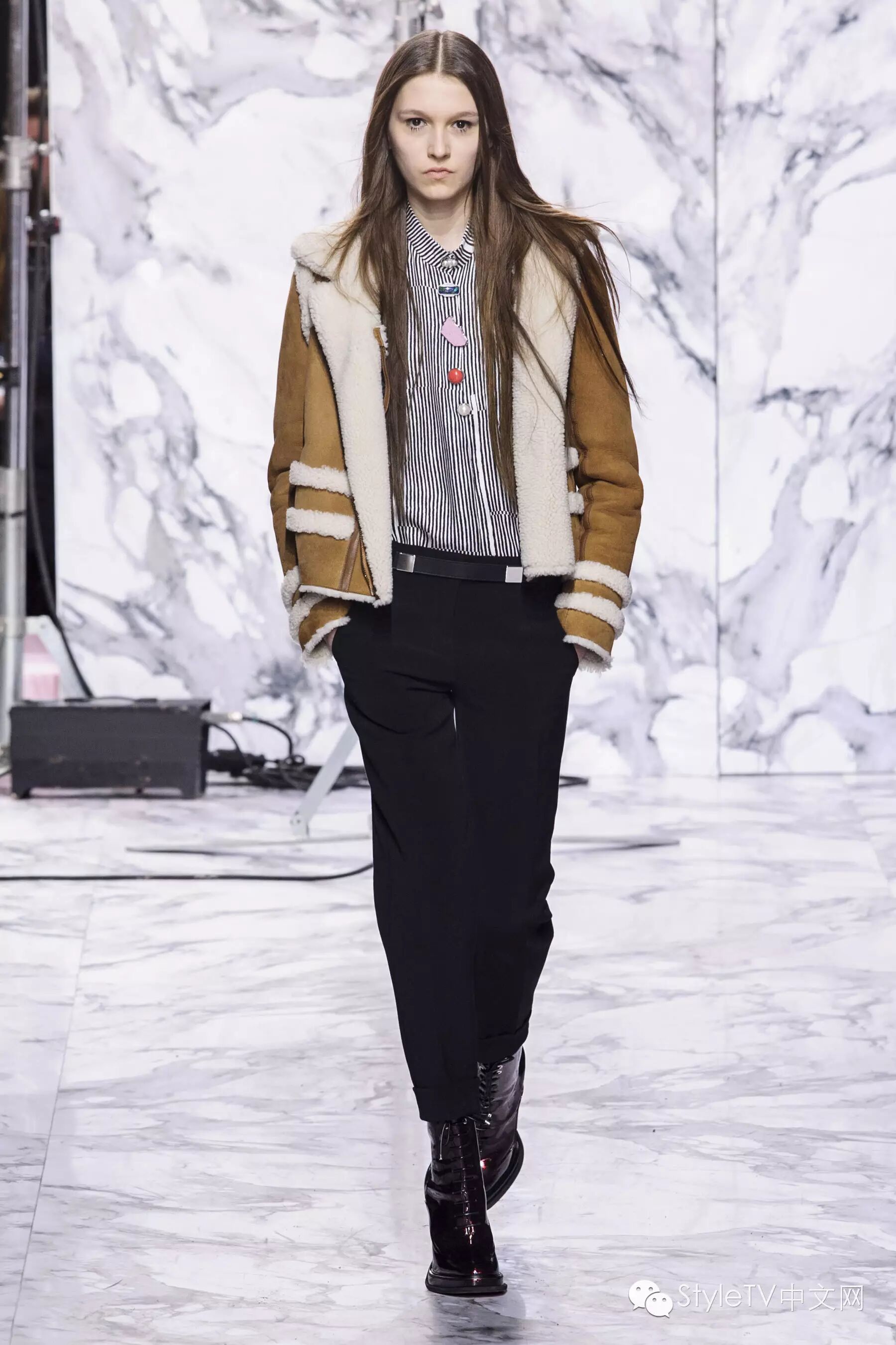 开场的第一个look就是以炭色毛羊皮领夹克内搭条纹衬衫,搭配黑色长裤,缀有彩色大理石项链。毛羊皮也被运用于高腰线设计,无时不提醒着人们异域的高原气息。