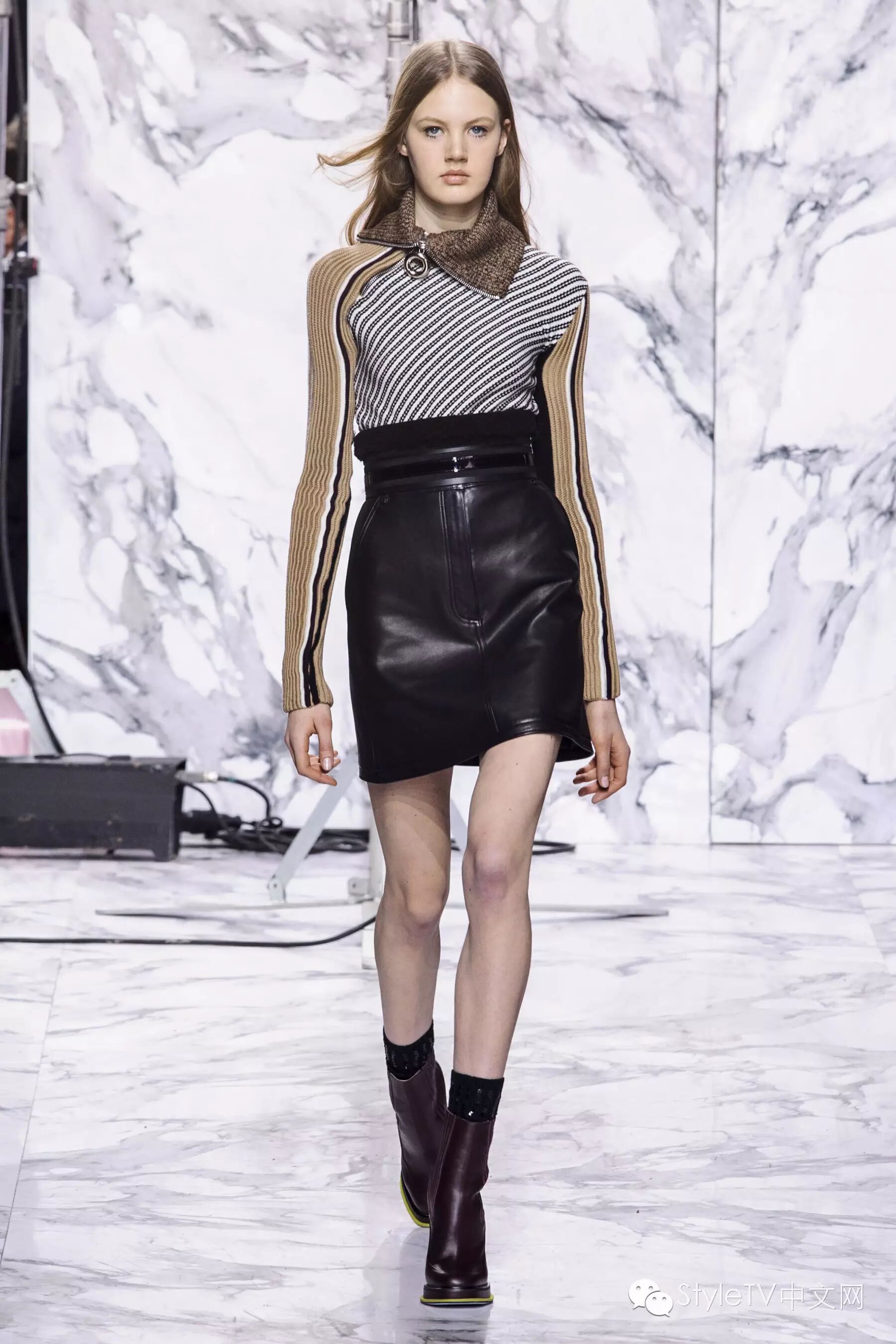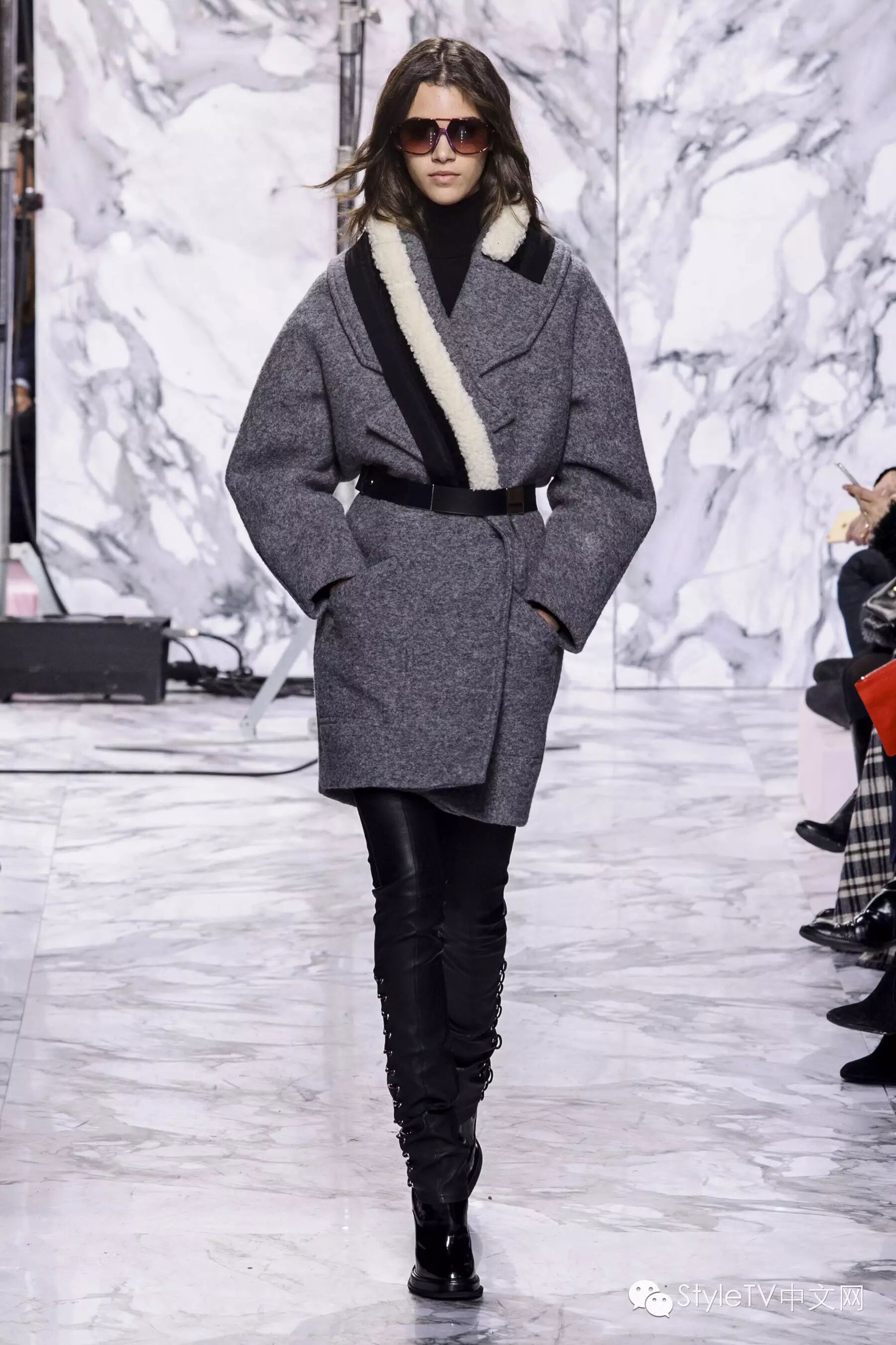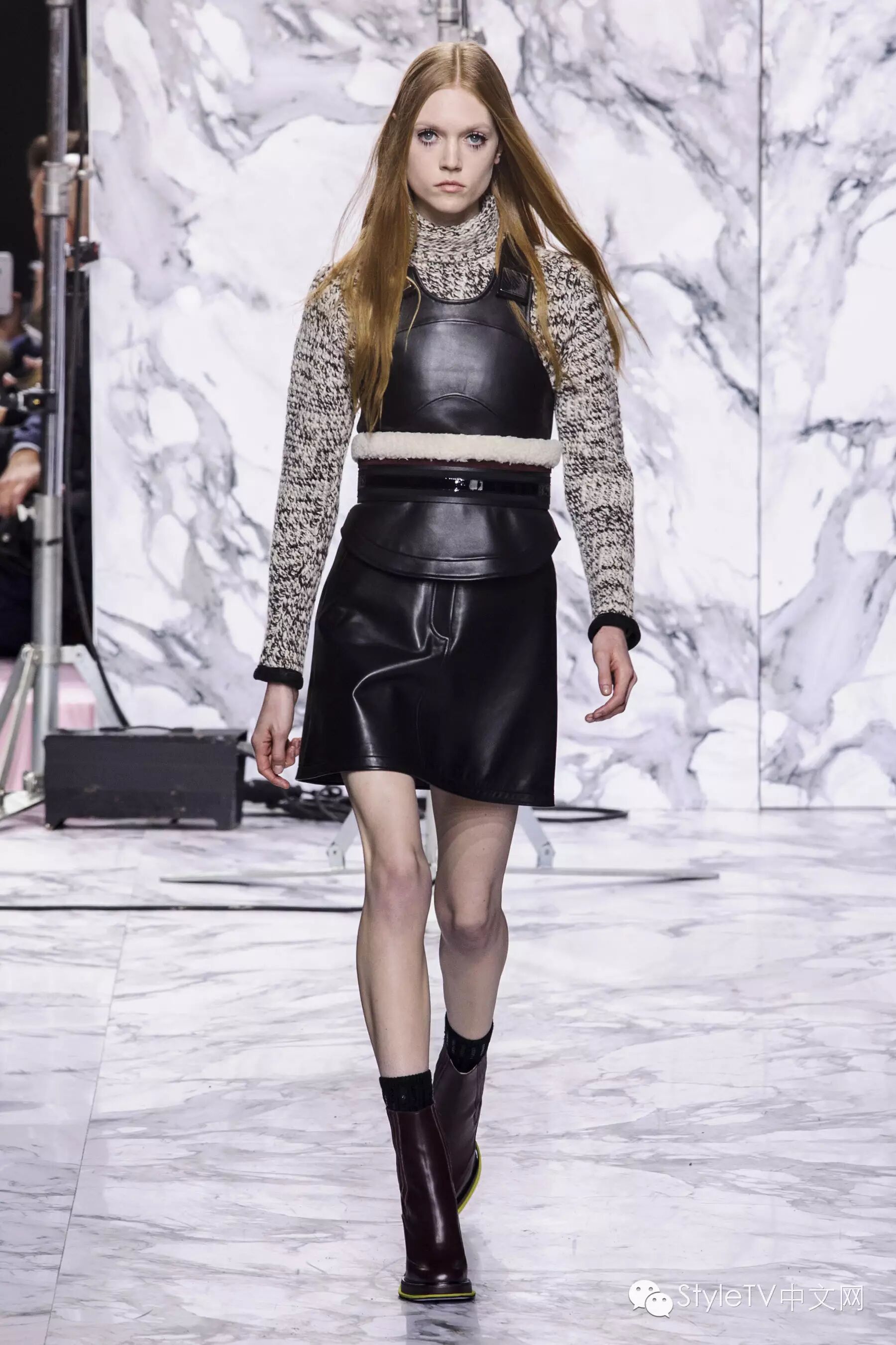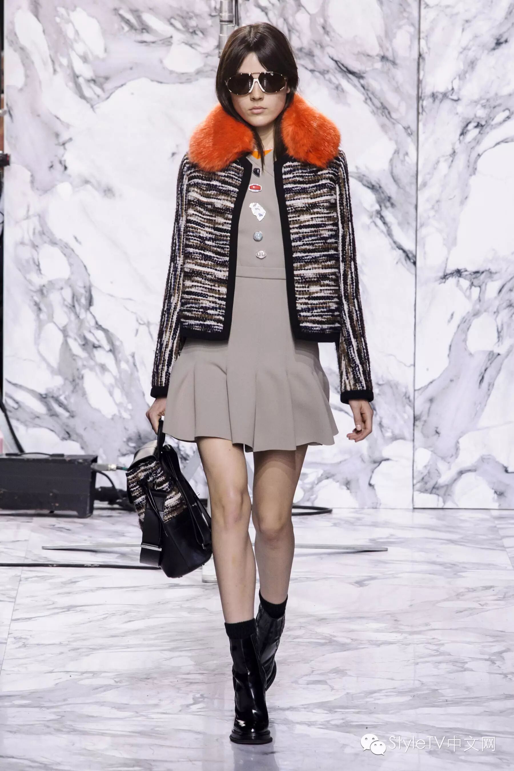 开场的第一个look就是以炭色毛羊皮领夹克内搭条纹衬衫,搭配黑色长裤,缀有彩色大理石项链。毛羊皮也被运用于高腰线设计,无时不提醒着人们异域的高原气息。