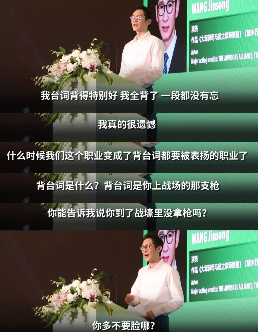 “什么时候演员成了一个背台词都要被表扬的职业了?背台词是你上战场的那支抢,你能告诉我说你到了战壕里没拿枪吗?你多不要脸哪?”