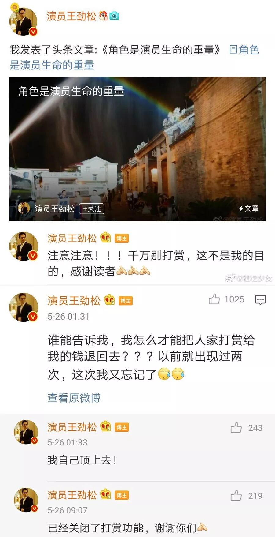 甚至还在微博写起了头条文章,粉丝打赏还被“残忍”拒绝。