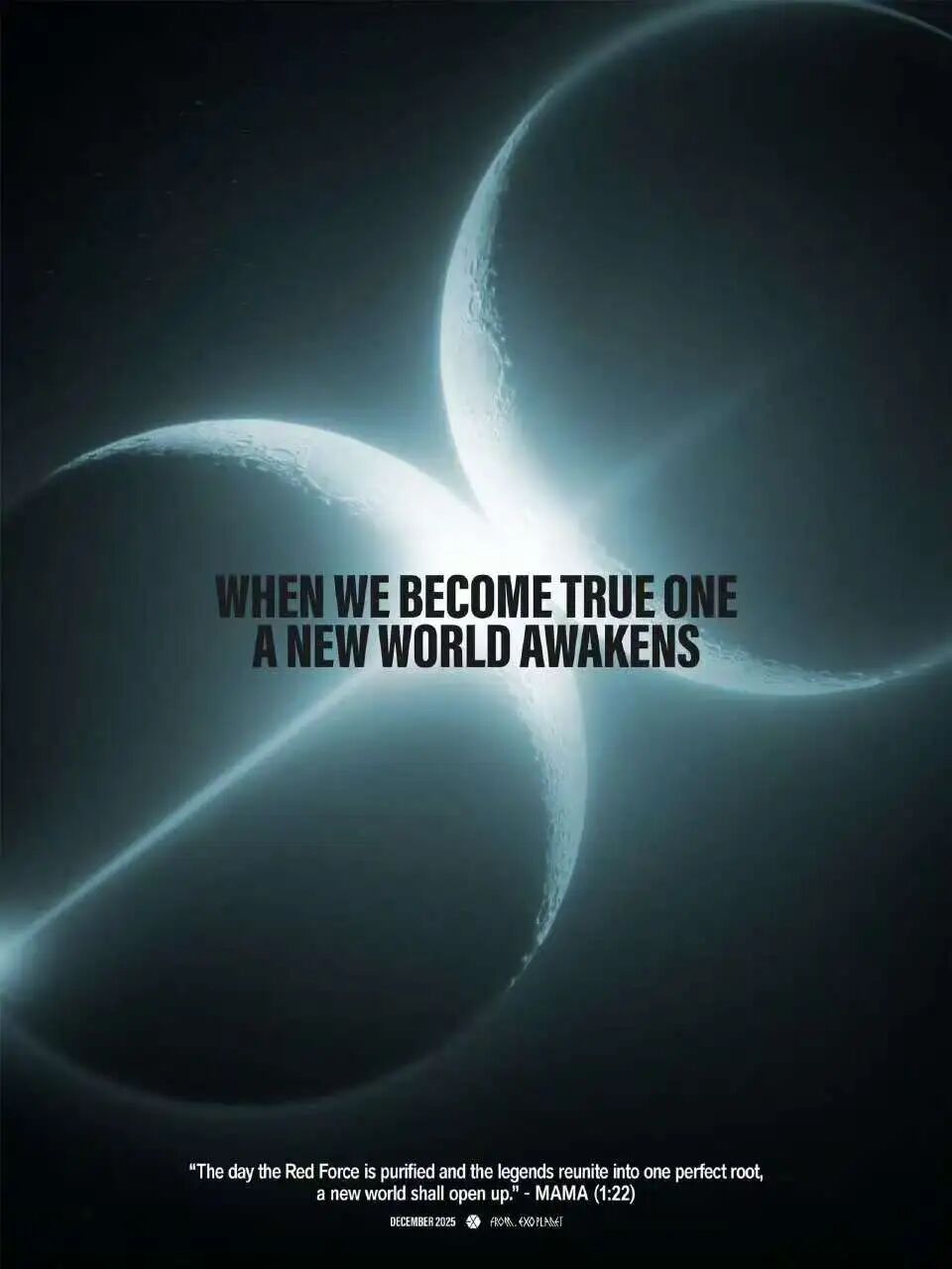 以宇宙中两颗星球交汇的科幻画面,搭配“当我们真正合为一体,新世界将觉醒”的文字,结合《MAMA》歌词引用与2025年12月时间标注,延续其“超能力”宇宙叙事,为粉丝见面会、新专辑等活动营造沉浸式概念氛围,呼应“WE ARE ONE”团魂,拓展世界观叙事。