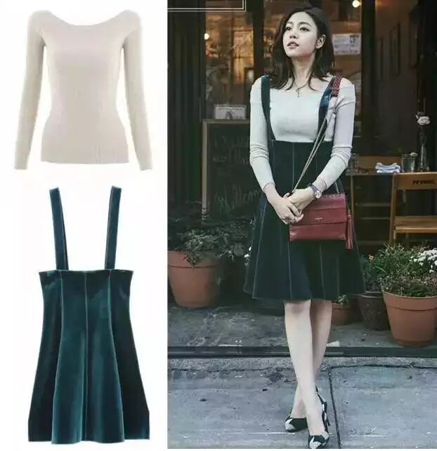 如果你喜欢背带裙,其实也可以这样穿。针织上衣搭配背带裙,这个春天就这样穿吧!