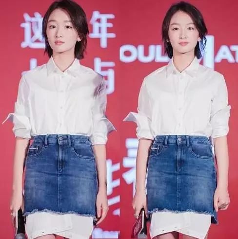 周冬雨白衬衫下面搭浅色牛仔短裙,不仅提高了腰线,而且增加了层次感,告别白衬衫的呆板,穿出个性与时髦,这里一定注意哦,搭配的重点是一定要露出衬衫下面的边边