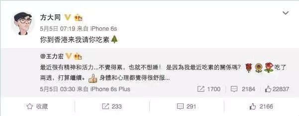 好友方大同随后转发微博声援:“你到香港来我请你吃素”。
