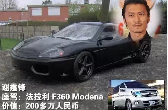 谢霆锋以叛逆青年形象出道,还曾因顶包案轰动一时,图中的F360为他当时肇事车辆,如今成功转型的他日渐低调,换了一台日产MPV代步。