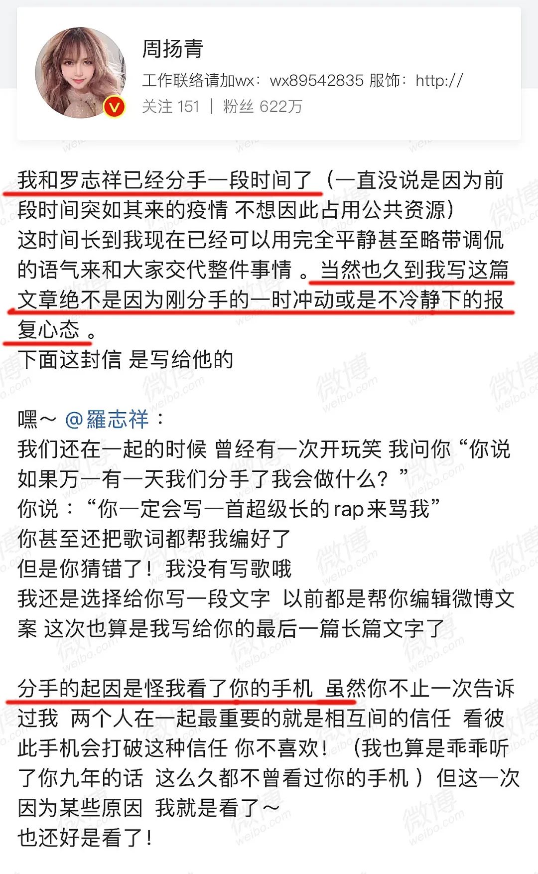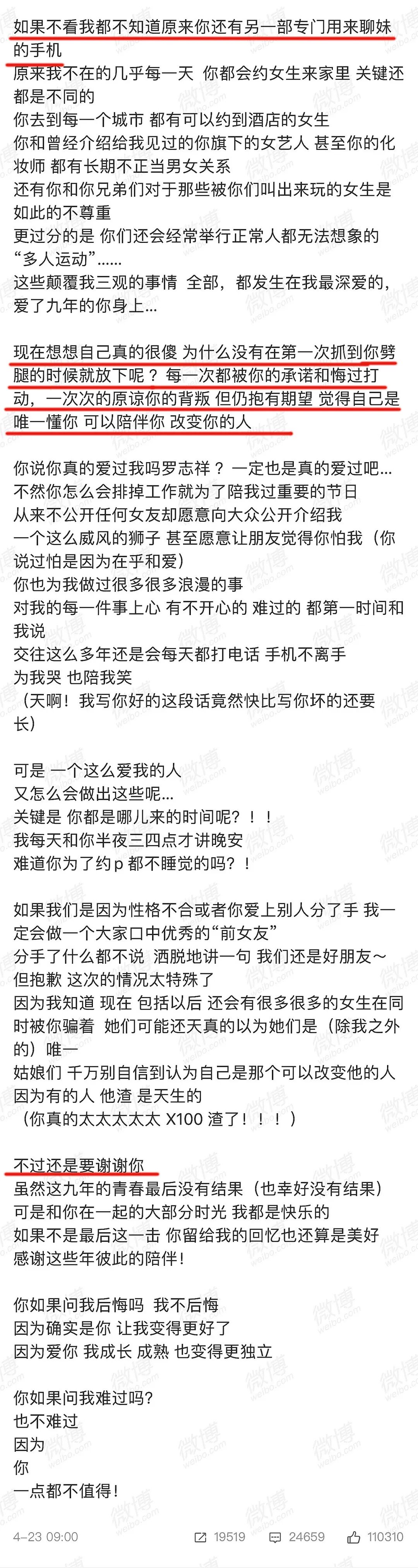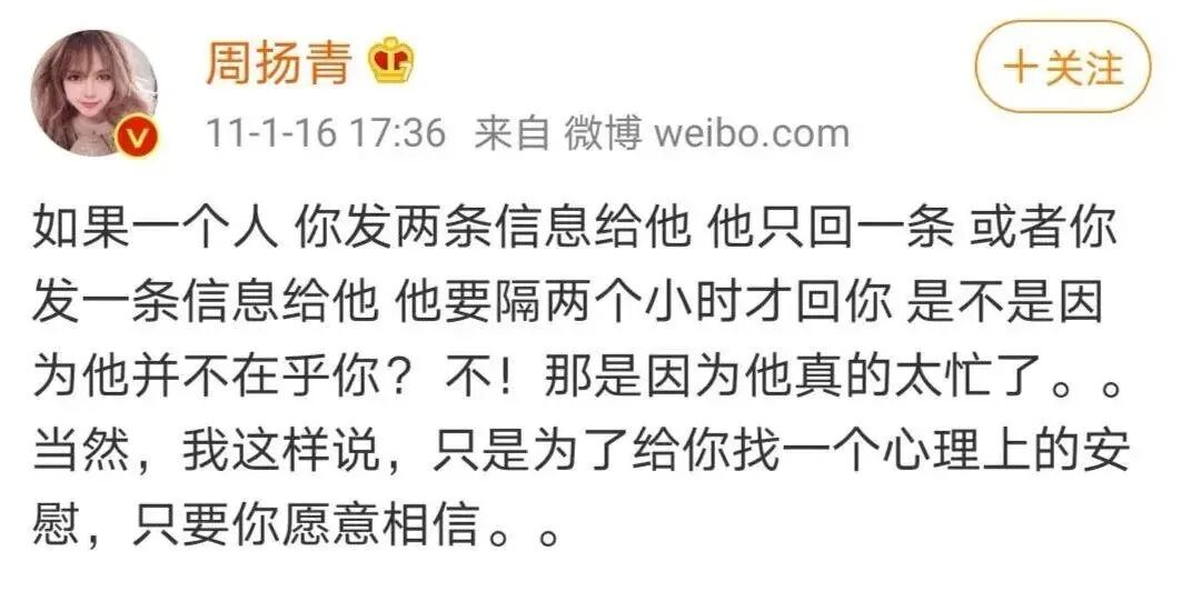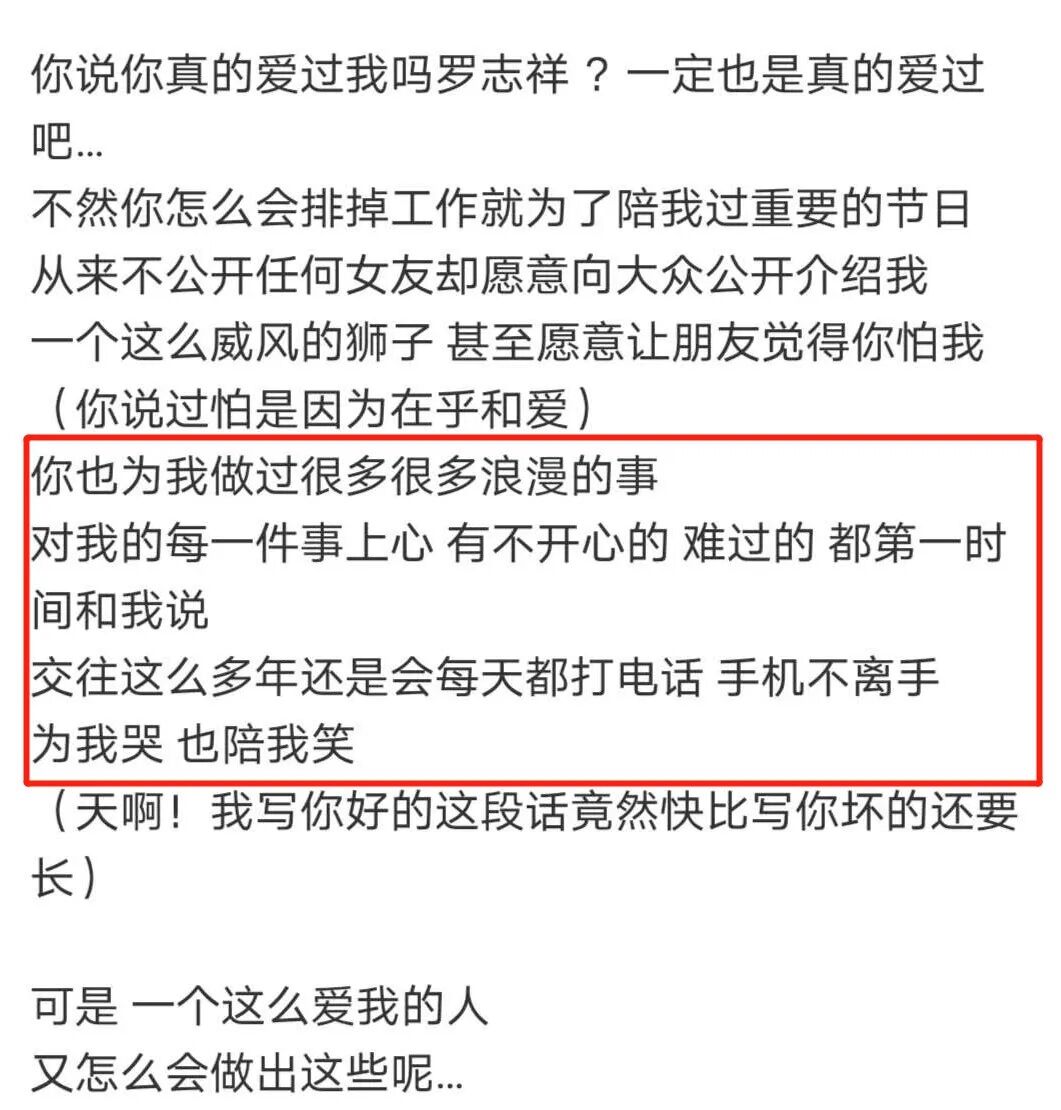 罗志祥回应出轨:为什么9年爱情,逃不过分手结局 谈心社 港台男星 2020-04-23 13:17:53 602 创作不易,用心坚持,欢迎请BaGua喝几杯爱心咖啡!打赏并支持本文 打赏并删除本文 热搜,爆了。周扬青发文,官宣与罗志祥已经分手。滑动即可查看周扬青官宣分手全文 / 微博@周扬青一封长信里,周扬青单方面宣布了自己与罗志祥的分手原因:再次发现罗志祥出轨。“现在想想自己真的很傻,为什么没有在第一次抓到你劈腿的时候就放下呢?每一次都被你的承诺和悔过打动,一次次的原谅你的背叛……”不久,罗志祥也做出回应。长达9年的爱情,分分合合,以分手告终。 恋爱九年,最终情散恋爱9年,两人从地下恋情到公开热恋,再到网传的疑似见家长、看婚房,一切都走在娱乐圈模范情侣的路上。所有人都知道的“地下恋情”2015年4月,罗志祥和周扬青被拍到同游日本,恋情曝光。但从2011年开始,两人的恋情,就是所有人心照不宣的秘密。 2011年1月16日的时候,周扬青突然在微博上发了一条略显忧愁的状态: 这样的小埋怨,所有网友都能看出来,周小姐估计是恋爱了。 后来没过几天,周扬青又发了一个明里喊糟,暗里秀恩爱的微博,回应那天感慨男友不爱回消息的微博。 虽然没有公开自己的恋爱对象就是罗志祥,但是她用微博记录下了自己恋爱中所有的心路历程。 每年的1月8号前后,周扬青都会在微博上秀恩爱。 每一条微博,都含糖量爆表。“我老公”;“你要和我一起证明给不相信异地也会有结果的人看看”;2015年的年底,在《康熙来了》节目上,罗志祥公开了自己女朋友的昵称——“周小姐”。 罗志祥是《康熙来了》的常客,从前他被主持人逼问恋情的时候,每每总是几句话岔开话题。 这么坦诚直白的接问题,这是第一次。 后来眼尖的粉丝们发现罗志祥和周扬青总是挑同一天发差不多的内容,晒各种美照帅照的时候背景板也几乎一样,家里的架子鼓又是一模一样…… 罗志祥没有直接公布,周扬青也就不急,两个人私底下恩恩爱爱一直到了2016年。公开热恋2016年12月,周扬青的名字第一次出现在罗志祥的微博上。 之后每一次臭美的自拍四宫格、六宫格、九宫格,罗志祥都要@周扬青来看。 “这波狗粮我吃还不行吗!”“小猪哥!秀恩爱太过分了!”粉丝们在评论区一边酸,一边祝福,甚至把孙红雷都被炸了出来。 2017年,罗志祥在综艺中坦言:周扬青是自己想要结婚的对象。而“8号快乐”则是罗志祥和周扬青的“暗号”,不管哪个月,只要到了8号就使劲秀。粉丝问为什么是8号,她还特别有耐心地回答:“八号是我们的纪念日。”公开前周扬青一个人的8号快乐,变成了两人一起发狗粮。 论起秀恩爱,娱乐圈的情侣们很难赶得上周扬青和罗志祥的频率。 后来罗志祥又上了《康熙来了》,早已公开恋情多年的罗志祥提到女朋友的时候,再也不是当初那么三缄其口了。 他特别大方地表示:跟周扬青在一起代表自己的人生开始了第二阶段。 不止罗志祥“秀”,周扬青也天天在微博里cue罗志祥。 在周扬青的微博上,还Po着她和罗志祥妈妈一起的搞怪自拍。 看着他们俩一起携手走过第9年,所有周扬青和罗志祥的粉丝们都坚信: 如果罗志祥要结婚,那新娘一定是周扬青。分手传言分手传言,在2020年年初就有:往日蹲守在两人的社交平台底下等着吃狗粮的粉丝们发现,两个人已经好几个月,没有过互动了。 最后的互动,留在了1月23号…… 两个人之后Po出的照片中再也不见对方的一点儿踪迹。 就连情人节,两个人都默契地没有再@对方……“罗志祥周扬青分手了吗?”“为什么不秀恩爱了?狗粮呢?”细心的网友甚至扒出罗志祥疑似出轨的消息,赞同的人有,不信的人也多,粉丝在两个人微博下吵来吵去,结果只等到了罗志祥经纪人的7个字答复: “艺人私事不回应。”直到今天周扬青微博官宣,曝出对方出轨,粉丝们又炸开了锅。九年恋爱最终情散,有人吃瓜,有人惋惜……新鲜感是如何打败爱情的罗志祥爱过周扬青吗?想必是爱过。否则,也不会公开官宣,为其手机不离身。“一个爱我的人,怎么会做出这些” / 周扬青微博罗志祥是否出轨尚未石锤,但他们之间的新鲜感,似乎渐渐消磨殆尽。经济学中有一个名词——“边际递减效应” 。即:对于同一件事情,投入的次数越多,得到的效用越少。对应到爱情中也是一样:与对方接触的次数越多,感受到的刺激越小。追求新鲜感,是动物的本能,人类身上也存在类似的现象。有学者曾做过一个实验——对一批男性,施加同一种方式的性刺激,另一批男性则施加不同种类的刺激,记录其反应。结果发现,接受重复刺激的前者,很快会疲软。被不同方式刺激的后者,则会保持长时间的兴奋状态。我们不得不承认:人本就极其容易对多个异性,同时心动。这就解释了统计数据中,出轨的概率,为何会居高不下。18-61岁人口外遇比例 / 潘绥铭“性之变”2015年四次全国调查结果哲学家在《爱、欲望、出轨的哲学》一书中得出结论:无论何种教育程度,无论当时流行何种道德或法律规范,总会有人出轨,人类史就是一部出轨史。忍不住幻想第三人的陪伴,为另一个人的默契怦然心动,不由自主地多看几眼漂亮的异性,这些想法,可能大多数人都有。维系爱情的是什么人性和本能、旧爱和新欢、厌倦和新鲜……爱情有无数对手。既然出轨是本性,那么维系爱情的又是什么?道德和责任感人类的一切关系,本