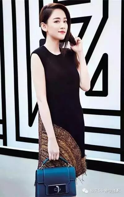 黑色的无袖裙,裙角弧线式粗毛的点缀,让裙子更有设计感,拿手提包,很知性干练。