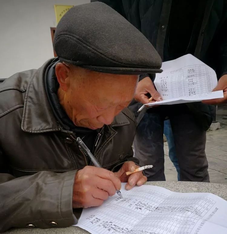 合作社老人们在发放红包的表格上,认真签写自己的名字。