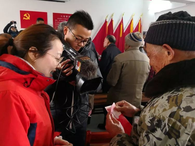 湖北电视台专注三农的《垄上频道》记者采访拿到红包的老人。