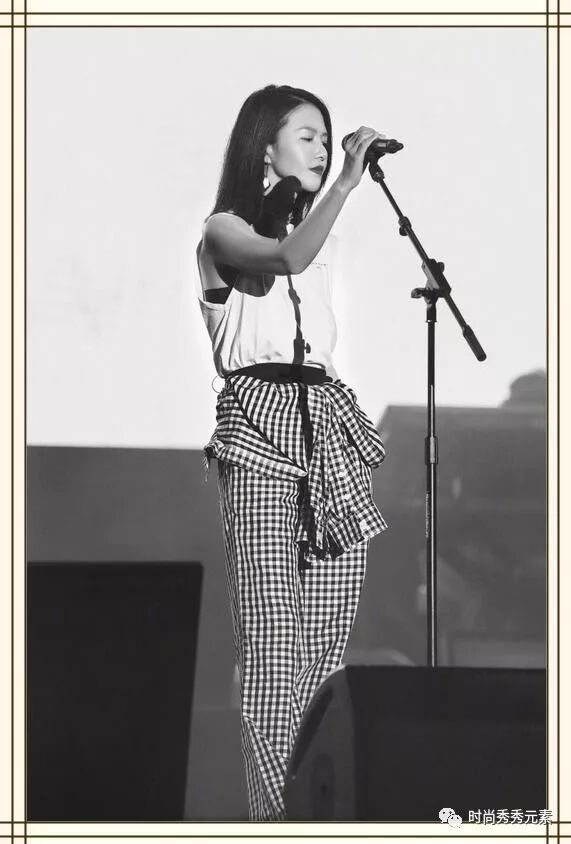 无袖上衣搭配格子裤子,这样看起来也是非常好看的,在舞台上的谭维维也是气场十足,这样的穿搭穿在谭维维的身上也是如此。