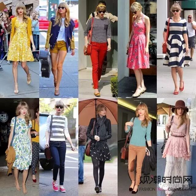相比其他明星的造型,Taylor Swift的街拍要接地气得多。无论是穿衣风格 品牌选择上,虽然少不了如Dolce&Gabbana之类的大牌,但也有不少价格非常亲民的衣服或包包。