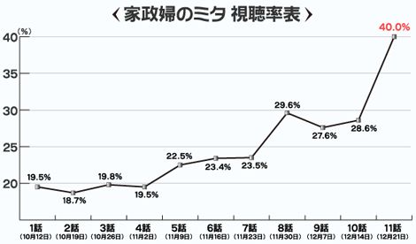 第一话收视就冲上19.5%,最终话最高瞬间收视率42.8%平均收视40.0%,达到历代第三。