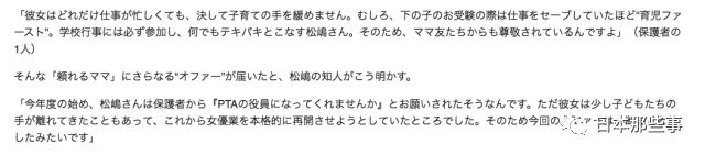 除了精心挑选学校,学校的其他妈妈们也很信赖松岛菜菜子。不是因为演员身份,而是因为极其认真负责。学校PTA(家长与教师协会)甚至邀请她做干事。