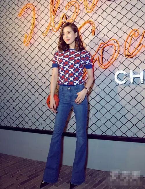 飞机图案的短袖上衣搭配牛仔阔腿裤和黑色高跟鞋,如此干练优雅的造型,好美啊。搭配橘色链条包,简单大方。