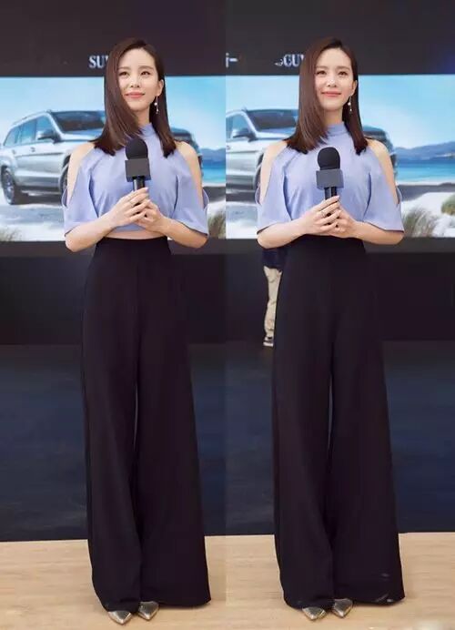 近日刘诗诗出席活动,这身打扮真是女人味十足。浅蓝色露肩上衣,短款设计,露出小腰腹,性感迷人。搭配黑色高腰阔腿裤和金色尖头高跟鞋,给人一种淡雅别致的感觉,特别的清新有气质。