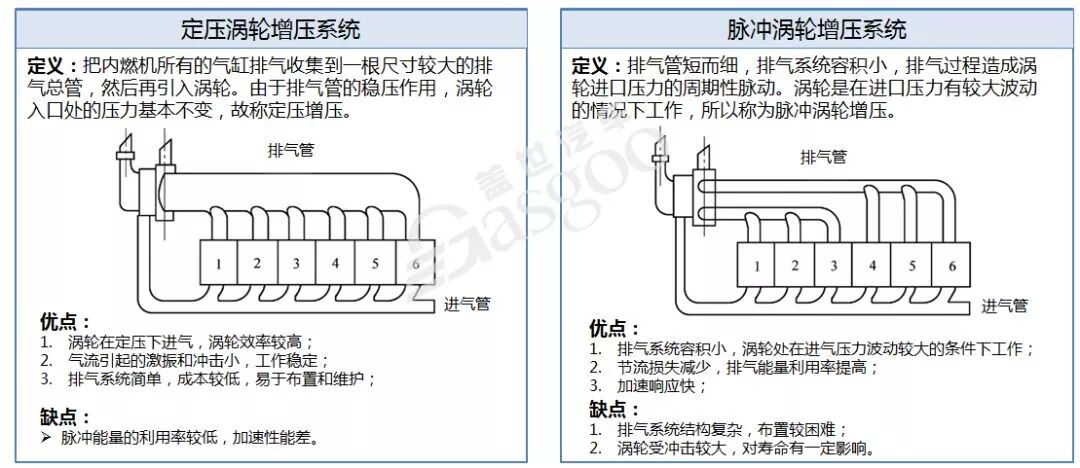 涡轮增压器分为定压涡轮增压和脉冲涡轮增压;在低增压时,采用脉冲增压较为有利,而在高增压时,应根据实际情况(如用途、气缸数目、行程数、在发动机上的安装方式)综合考虑进行选择。