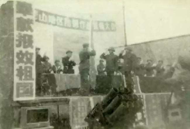 图为我军149师的誓师大会。旁边有一门107火箭炮