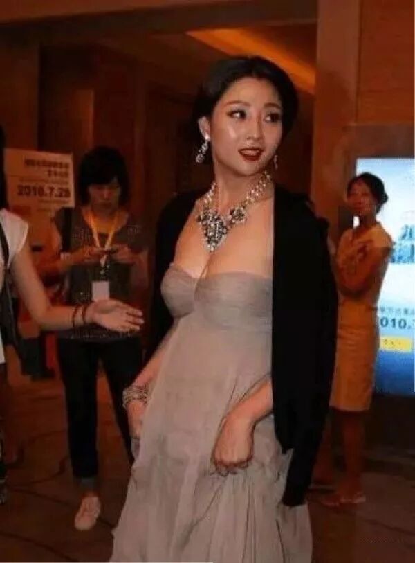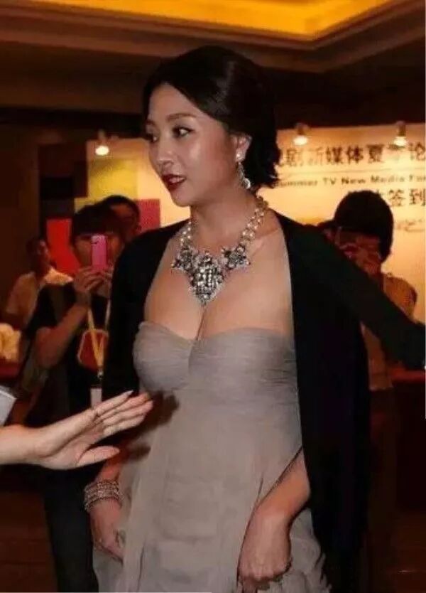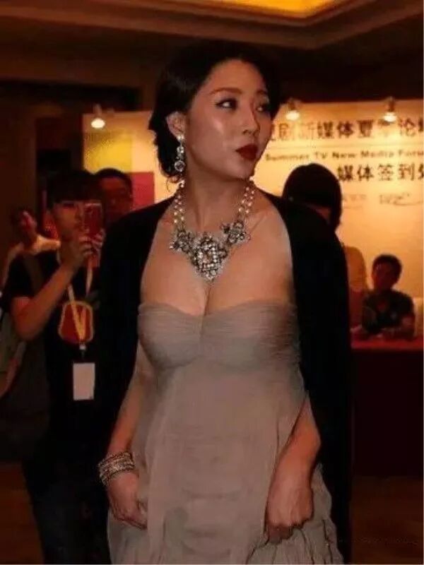 看她穿着一件灰色的裙子是那种低胸,是特别的性感的裙子了,外面再套了一件黑色的外套就比较的简单,她的脸看起来是真的非常的油腻啊,怎么还不到40岁就这么油腻了?
