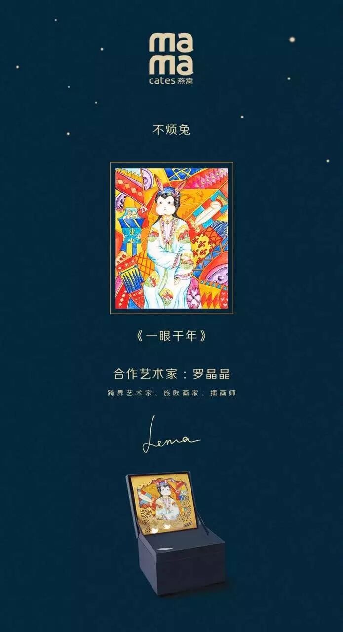 “不烦”的意思正是“喜”,这次专门把罗晶晶的作品用到了“喜兔月饼”的礼盒包装上,也使产品从内到外都充满了神秘、浪漫的艺术色彩。