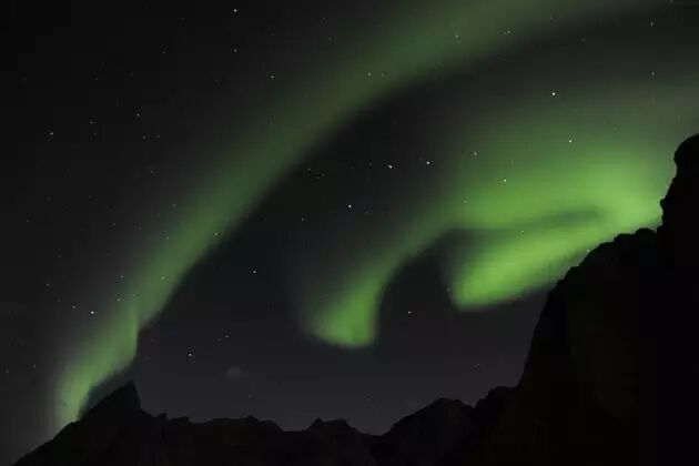 这应该是一生中最震撼的极光,从最初的轻舞般的淡淡绿色帷幕,到浓浓夺目的惊艳色彩。有时如同一条飘忽的绿色绸带横贯在空中,从山的那一面一直越过北斗星空,飘逸在月亮的旁边。有时又聚集在夜空某处,如同迎风挥舞而飘扬的旗帜,层层叠叠地画出“老鹰之路”般的画面。有时又如同绿旋风般把整个山峦照亮。