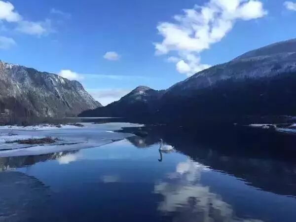 穿过饭店房间的阳台可以通向湖边。那天,湖面清澈倒映着天空的蓝,正好有几只天鹅在戏水,美的像梦境一样。