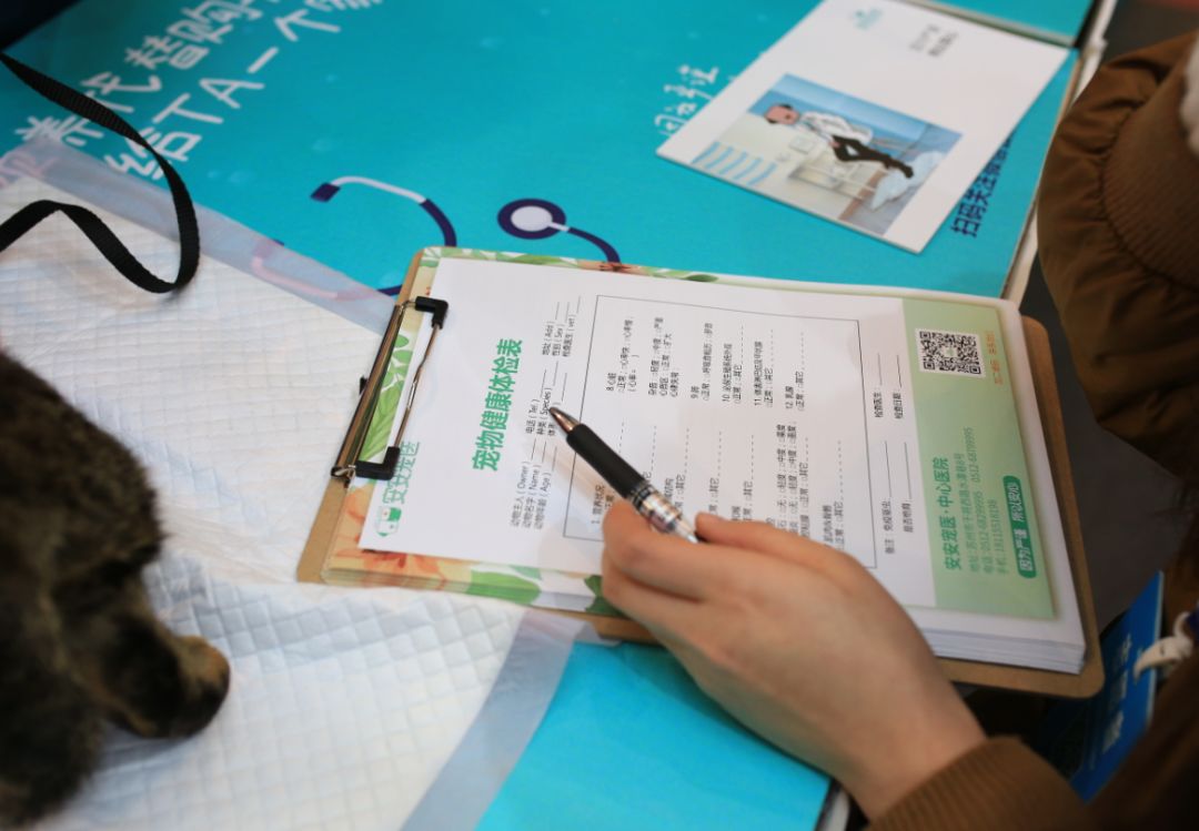 活动现场,安安宠医为现场每只待领养动物都做了免费体检并出具健康情况报告,提出建议。