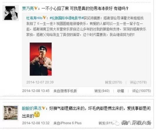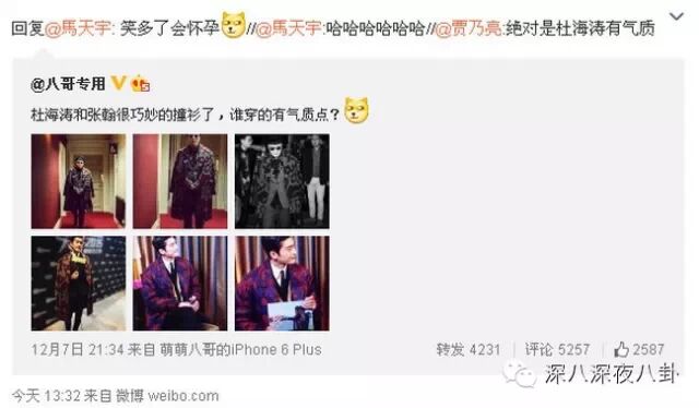 然后前几天张翰杜海涛的撞衫事件也是很醉的。有个号儿就说他俩撞衫,然后呢贾乃亮上去转发了一下说“绝对杜海涛有气质”,就。。。。。。不好了