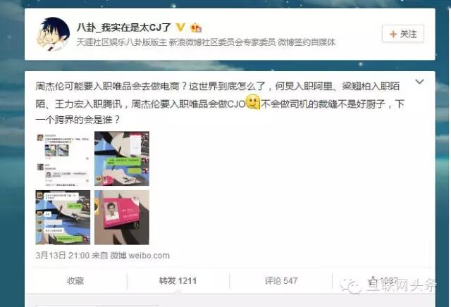 据“朝阳区”民众在网上爆料,杰伦可能要入职唯品会做电商。
