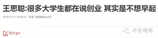 王思聪近日在节目中说到:“现在很多大学生都在说创业,其实是给自己不想早起、不想朝九晚五工作的借口,创业本身是一条很难的路。”他认为很多20多岁的年轻人不具备创业能力,建议应届毕业生应该先锻炼自己。