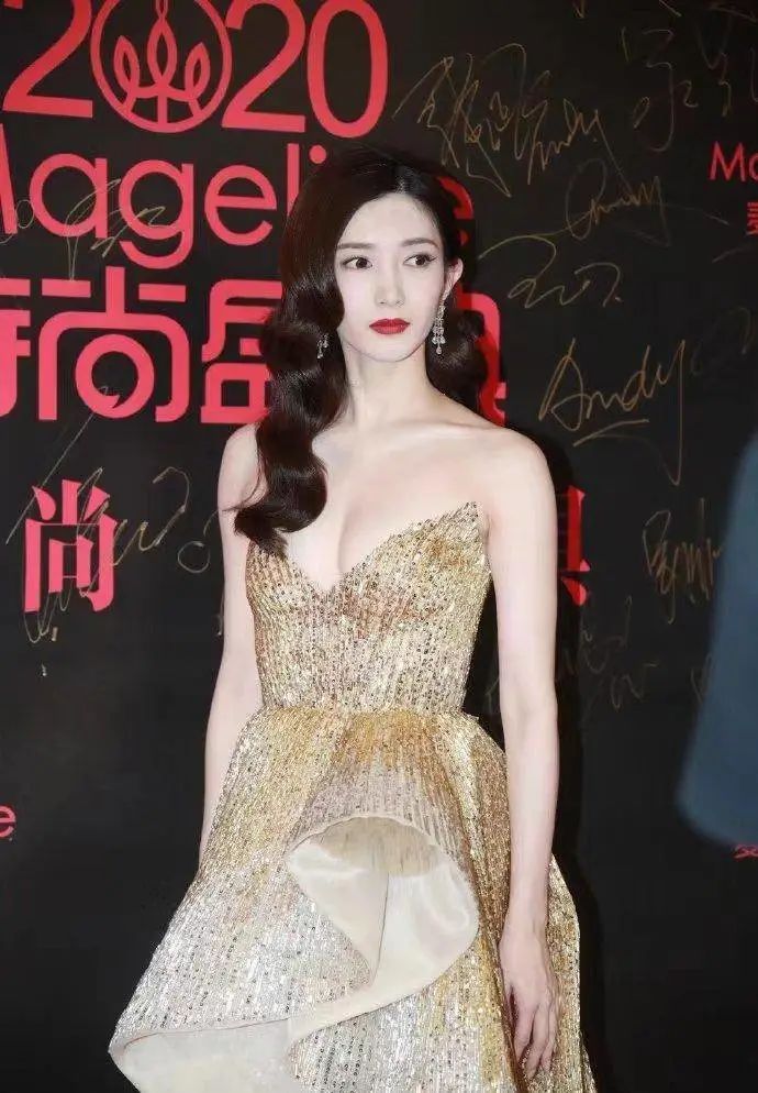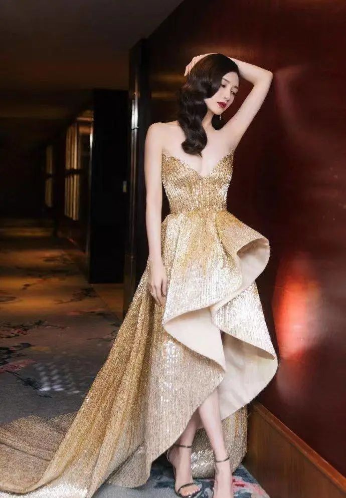 江疏影身穿金色抹身材连衣裙,时尚又优雅,火辣身材美到优雅新高度。