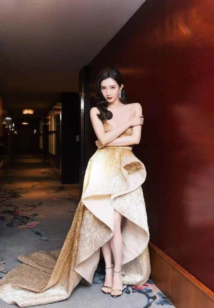 通过金色面料的反光和裙子的处理,江疏影的腰部更加纤细,让她的三七比例更加凸显。