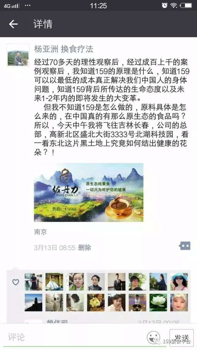 大家好,我是杨亚洲,长期从事健康养生培训、辟谷疗法和公益禅修活动。去年12月下旬,有幸接触到159,当我看到159的第一眼,以我的直觉和专业角度来看,159绝对可以在2016/2017年火爆中华大江南北,绝对可以和我个人所做的辟谷养生事业无缝对接!佐丹力所倡导的企业文化与我一直来的所践行的养生处世理念高度契合!159元一盒的价格以及早晚换食课又绝对可以让它们完美落地!159绝对是当今时代的一款革命性、趋势性产品!特别对当今医药行业、大养生行业来说绝对是一颗炸弹!今天无论你吃不吃159,我知道你迟早有一天会吃的,未来功能食品必然取代药品,预防大于治疗,民以食为天。最好的医生是自己,最好的医药在厨房,最好的食疗是159。