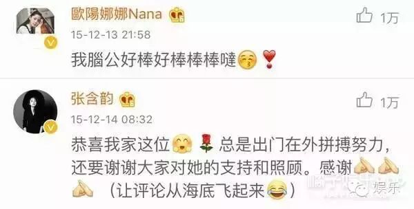 除此之外,猫姐还发现,不仅颖宝喜欢处处留脚印,她自己的微博下面也会有资深脑残粉。这枚脑残粉就素—张含韵and欧阳娜娜!