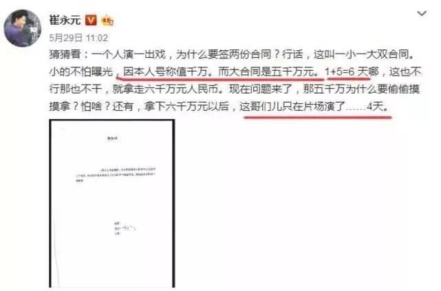 2018年,范冰冰似乎流年不利,先是高云翔在澳洲涉嫌性侵被捕,导致《巴清传》一再延播,如今更是因为《手机2》的开拍,导致前著名主持人崔永元在网上掀起骂战,本以为,此次事件只是简单的骂战而已,可是谁知道,崔永元居然爆料出范冰冰那一大一小价值6000万的合同(小合同1000万,大合同5000万)。