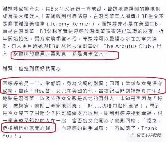 谢婷婷首度公开3岁女儿正面照,非混血儿,长得像谢霆锋俩儿子 情感故事糖糖 港台女星 2022-09-09 17:49:07 354 创作不易,用心坚持,欢迎请BaGua喝几杯爱心咖啡!打赏并支持本文 打赏并删除本文 点击卡片?关注情感故事糖糖9月7日是谢霆锋妹妹谢婷婷的40岁生日,身处加拿大温哥华的她公开多张生活照,为自己庆生!其中,谢婷婷三岁女儿Sara首度曝光正面照,大家发现她毫无混血迹象,有遗传谢家少许基因,五官可能偏向其亲生父亲。谢婷婷向来保护女儿隐私,不知道为何,这次突然放出Sara的正面照,难道是准备带着女儿返港继续其娱乐圈事业?港媒则指,谢婷婷很有可能是一时失手发错了照片,或者忘记给女儿的脸打马赛克,导致女儿真容曝光。证据就是,谢婷婷公开照片大约一小时内就重新编辑,用图案重新遮挡女儿的容貌……谢贤的基因有多强,大家可以从谢霆锋、谢婷婷的五官看出来,而张柏芝跟谢霆锋所生的两个儿子,同样遗传谢家基因,长得超像谢霆锋,特别是长子谢振轩。说起来,谢婷婷的女儿也长得有点像两个表哥,对比一下他们三人的照片,是不是眼睛跟鼻子都有谢家特征?谢婷婷在温哥华秘密生女,外界至今不知道孩子父亲是谁,港媒曾透露男方是当地富豪,与谢婷婷识于微时,两人应该是学生时代的朋友。港媒报道,谢婷婷产女后一直没有工作,证明她的另一半财力雄厚,对于男方的真正身份,作为父亲的谢贤都不敢说太多,但就没有否认“有钱人”这一说法。谢婷婷与谢霆锋的童年都生活在加拿大,直到谢贤决定返港,他们才跟着父母回国发展。谢婷婷完成大学学业即宣布出道当模特儿,后转行拍戏,但她在事业上的成绩远远不及父母跟哥哥,很快她就回到温哥华生活,低调生女。这次,谢婷婷亲手公开女儿的庐山真面目,直接澄清了孩子父亲是外国人的传言,看Sara的五官就知道,她是正宗黄皮肤,根本不是混血儿。此前,曾有媒体报道,谢婷婷另一半很有可能是这位外国人:现在看来,Sara的父亲大几率跟谢婷婷一样是华裔。另外,热爱打网球的谢婷婷早前在当地参加了比赛,并与搭档勇夺冠军奖杯。谢婷婷留言表示,她获得冠军之后,带着奖杯回家并送给女儿,Sara的表现令她这个妈妈非常感动,“她(Sara)用双手把奖杯高高举过头顶,喊着妈妈赢了,然后把奖杯靠近胸口,低头看着奖杯说:谢谢你,妈妈。”虽然谢婷婷为女儿牺牲了自己的事业,但相信她绝对不会后悔。谢婷婷将女儿称为“小天使”“小老师”,她感谢孩子让她的心灵富足,女儿就像一道光那样,照亮了她的人生,她将会永远守护Sara。至于孩子的爹是谁,迎来40岁的谢婷婷一丁点都没有提及,大概对她而言,已经不再重要了。如果喜欢,记得点“赞”和“在看” 创作不易,用心坚持,欢迎请BaGua喝几杯爱心咖啡!打赏并支持本文 打赏并删除本文 感谢您的支持鼓励,我会继续努力的!文章地址:用户邮箱:打赏金额:USDT 请输入数字点击”去打赏“,即可进行打赏支持本文章哦 谢婷婷 发表评论