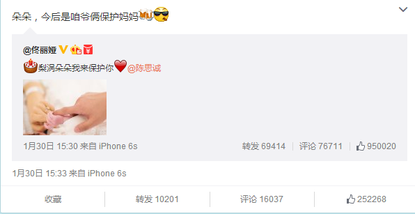 佟丽娅好友董璇也在微博上恭喜佟丽娅“有多了一个情人保护你”,再次间接说明“朵朵”应该是个男生。
