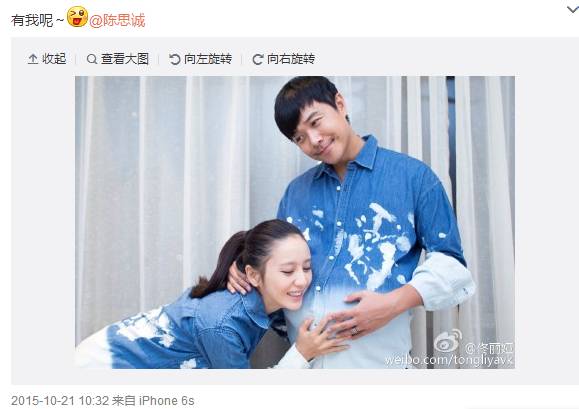 随后,佟丽娅也发布了一条微博回应怀孕的消息,图片为陈思诚挺着大肚,佟丽娅则贴近丈夫的肚子听“胎动”,附文称:“有我呢”。