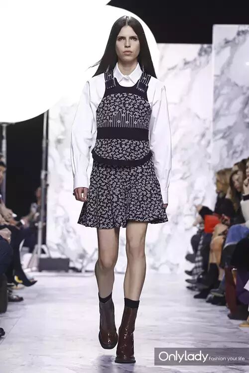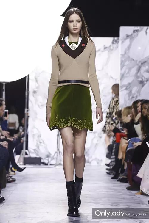 Carven 2016秋冬系列最大看点有三,一个是Carven最拿手的俏皮的小A字裙,不同材质、不同印花的高腰A字裙让美腿一览无遗,配上贴身的上衣,利落挺拔又少女。