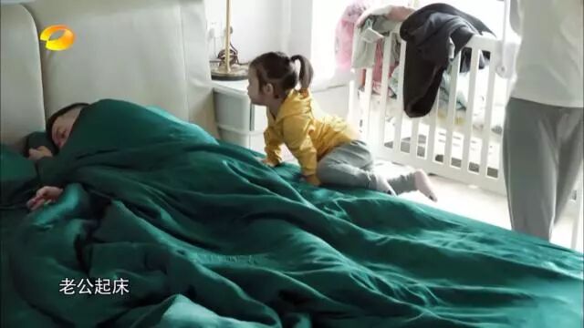 王栎鑫毫无反应,王大姐索性爬上床,一边叫“老公起来”,一边拉爸爸的被子,这一句“老公起来”应该是妈妈教的吧~