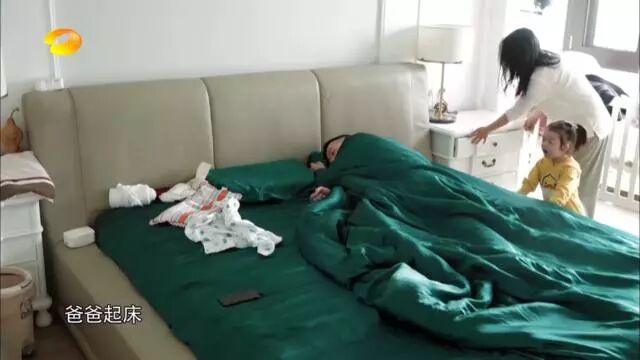 开始录制的第一天,王栎鑫就睡到自然醒,女儿王唯伊蹦蹦跳跳地跑来爸爸妈妈的房间,奶声奶气地叫爸爸起床~