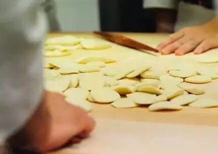 我从小就跟爸爸学这个,右手先是食指跟拇指拿竹板,把馅儿挑进去之后,板儿一甩,夹在食指和中指中间,两手的虎口一对,挤出来一个小饺子。但是母亲和姥姥,她们是北方人包饺子的习惯,就是用筷子挑完馅儿放下筷子,然后要捏出一串儿漂漂亮亮的饺子褶儿来。