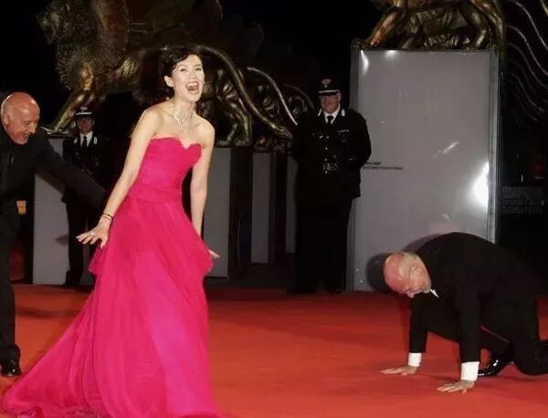 当他们开始走红毯的时候,前来捧场的威尼斯电影节主席马可·穆勒(MarcoMuller),居然直接下跪在章子怡面前。