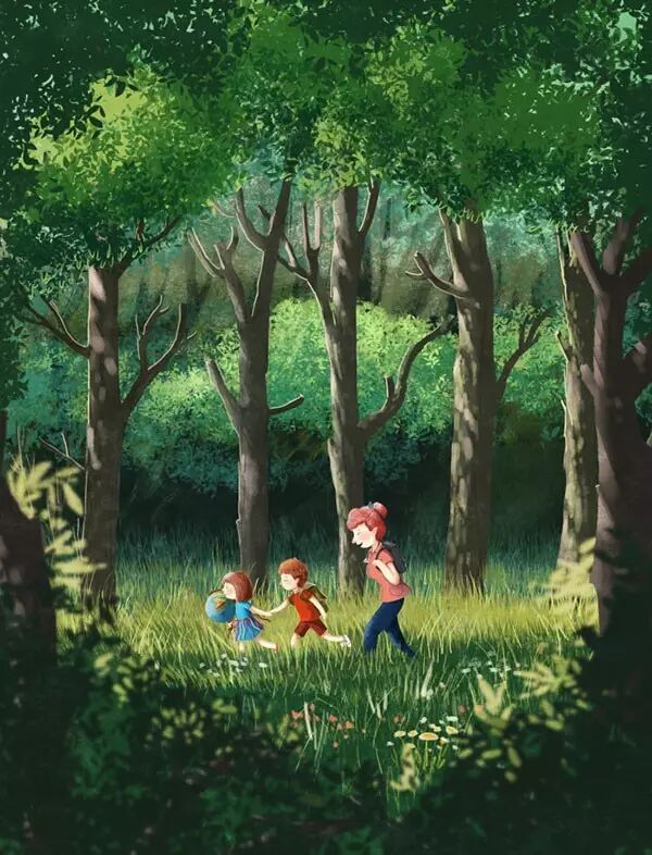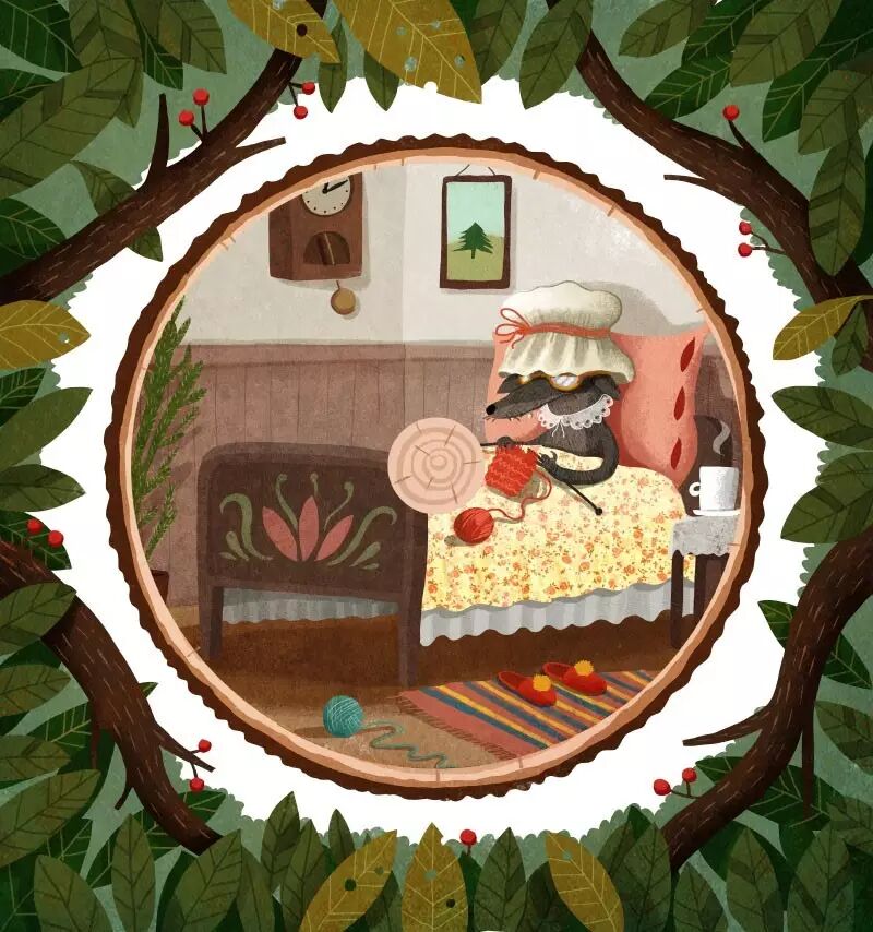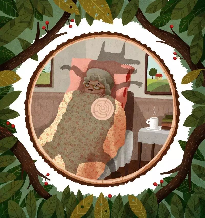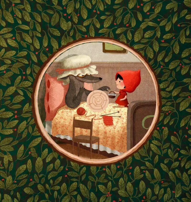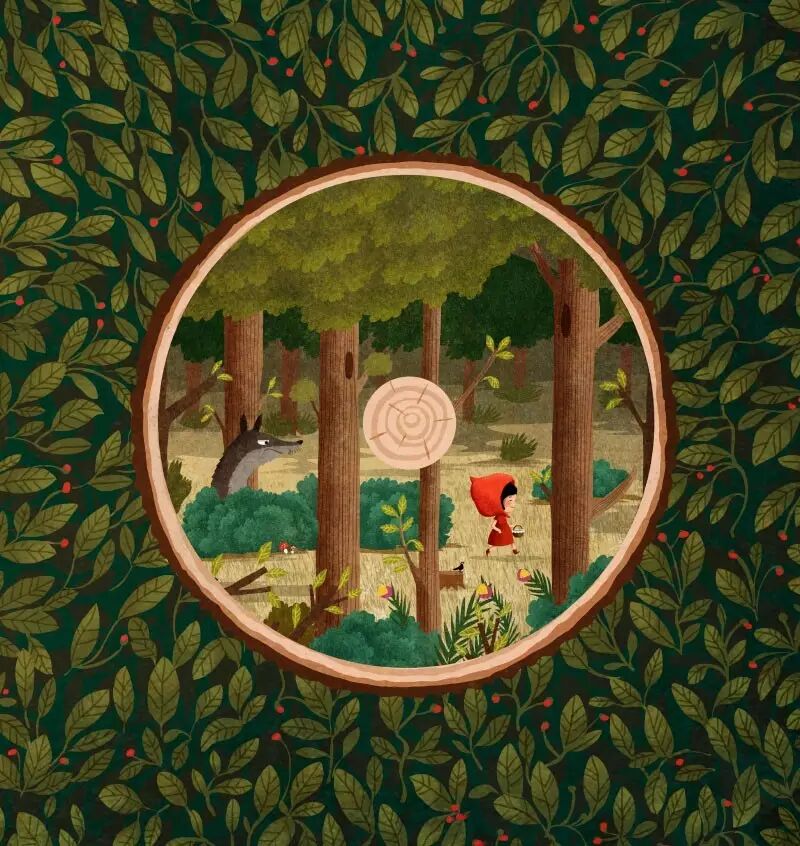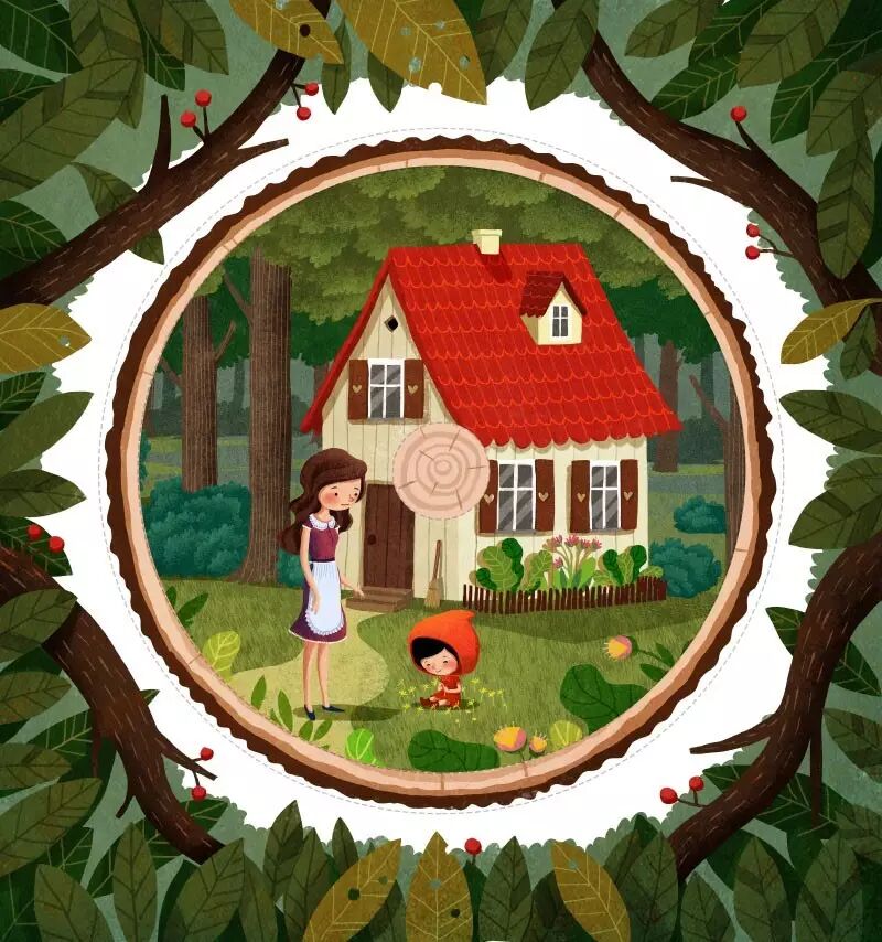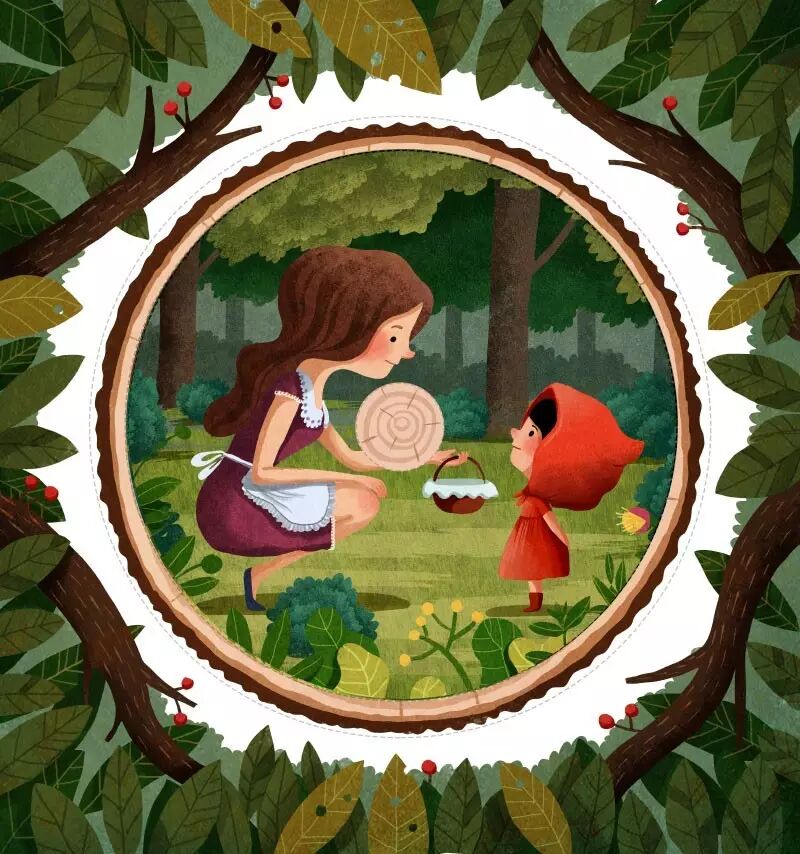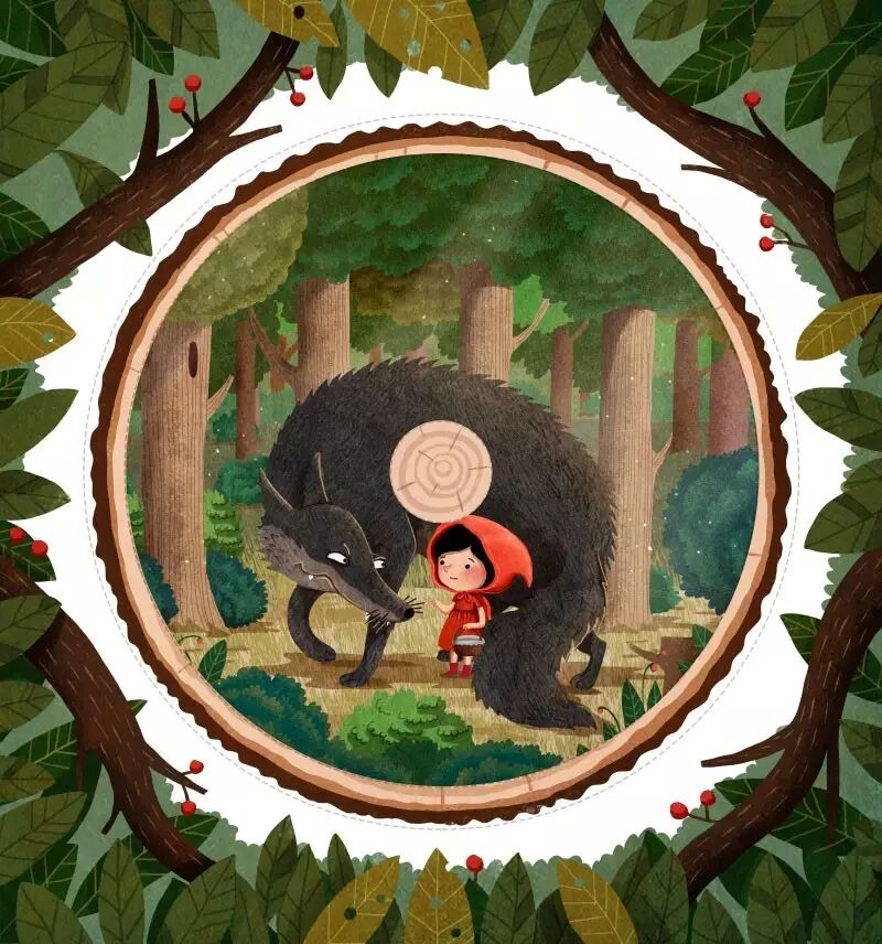 以下这组插画就是来自于大家非常熟悉的“小红帽与大灰狼”的故事,让我们回到还不认字的小时候,一起来给这些插画配上故事吧~