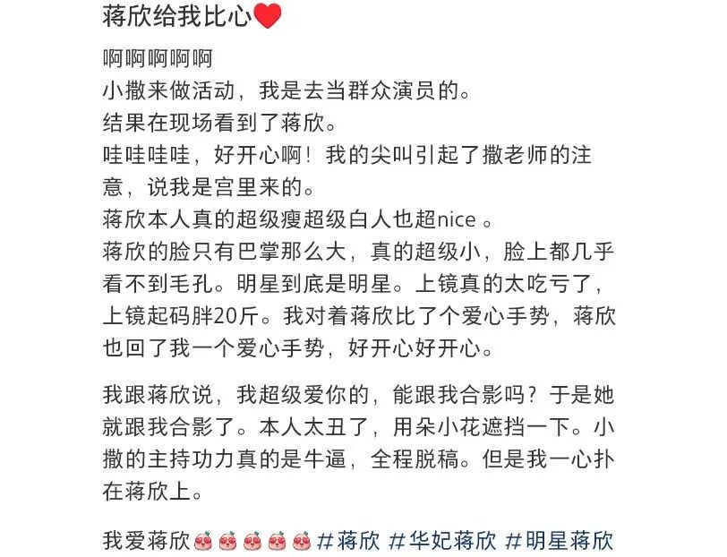偶遇撒贝宁蒋欣录节目,40岁蒋欣瘦成纸片人,皮肤白的发光超级美 一句话一封信一段情 内地男星 2023-08-27 08:30:17 384 创作不易,用心坚持,欢迎请BaGua喝几杯爱心咖啡!打赏并支持本文 打赏并删除本文 近日,有网友偶遇到了主持人撒贝宁以及演员蒋欣等人一同录制节目,并激动发文称看到了蒋欣相当激动,还引起了撒贝宁的注意,超搞笑。网友小姐姐大赞蒋欣本人超级瘦、超级白,性格也超级nice,评价相当高。除此以外,小姐姐还猛夸蒋欣的脸只有巴掌那么大,脸上皮肤好得不得了,都看不到一丝毛孔,实名羡慕啦。最后,小姐姐详述了与蒋欣的小互动,蒋欣不仅主动回应粉丝的“比心”,还十分亲和地配合对方拍合影,性格确实如网友所言,很nice哦。从晒出的照片可以看到,网友真没有说假话,蒋欣本人的确好美啊,也是真的好瘦啊!前不久刚满40岁的蒋欣完全就是“逆生长”的状态,网友的爆照里,她扎着高马尾,化着淡妆,身穿白色T恤搭配蓝色衬衫外套和卡其色长裤,整体look休闲又不失干练。她还微微靠向网友,亲和力爆棚。不仅如此,蒋欣的皮肤是真的很白啊,都可以用“白的发光”来形容了,羡煞旁人。而她此番出镜也是真的很瘦,巴掌脸比之前更加惹眼,天鹅颈、纤细的手臂以及小蛮腰都将她的纤瘦身材完美展示。与从前比起来,蒋欣确实称得上是“瘦成纸片人”了有木有!另一张照片里,撒贝宁也出镜了。小撒笑得有些憨,画风瞬间就搞笑起来了,哈哈哈。身后的蒋欣在忙碌着手中的工作,在如此远的镜头里,蒋欣的纤瘦身材还是吸足镜头,巴掌脸让人无法忽视。不得不承认,现在的蒋欣确实是瘦出新高度了,每一次出镜都能凭借纤瘦身材赚足眼球。随后,爆照的网友还猛夸蒋欣真人的骨架一点都不大,还狂赞蒋欣是“高瘦白”美女,以及称对方是“上镜胖20斤”,评价确实很高。而从中也能想象,现在的蒋欣的确是瘦了很多。去年,蒋欣po出自己的生活随拍,当时她身穿黑色look大秀好身材。了解蒋欣的网友应该都知道,她的身材一直都备受热议。因为蒋欣前些年属于“忽胖忽瘦”,身材非常不稳定,因此还遭遇了不小的吐槽。而从去年晒出瘦身成功的美照后,蒋欣就一直保持得非常好,几乎每次出镜,都是瘦瘦美美的模样。由此可见,蒋欣现在对身材管理真的相当严苛。前些天,蒋欣迎来了自己的40岁生日。虽然已经到了不惑之年,但蒋欣本人的心态依旧保持都非常好,一点都没有因为年岁的增长而有所变化,非常棒。而在生日美照里,蒋欣也是各种卖萌不断,一袭黑色裙装不仅让大家看到了她的绝美好身材,同样也令众人佩服蒋欣保持身材的毅力。40岁的蒋欣仿佛随着时间推移愈发明艳动人了,她的脸上看不到丝毫岁月痕迹,甚至还比年轻时期多了几分成熟韵味,越看越养眼。生日当天,蒋欣心情好到飞起,各种卖萌pose摆不停,真是隔着屏幕都能感受到她的好心情了。除此以外,生日当天,蒋欣穿着长裙席地而坐的美照也是引发了网友的热议。因为这两张照片里,蒋欣将长腿露了出来,她的腿又细又直又白,并且膝盖骨头突出的非常明显,脚背青筋更是一览无余。由此可见,蒋欣确实是瘦太多了,和从前圆润时期“判若两人”。瘦下来后的蒋欣愈发耀眼动人,希望她未来继续保持这样的绝美状态,继续美下去! 创作不易,用心坚持,欢迎请BaGua喝几杯爱心咖啡!打赏并支持本文 打赏并删除本文 感谢您的支持鼓励,我会继续努力的!文章地址:用户邮箱:打赏金额:USDT 请输入数字点击”去打赏“,即可进行打赏支持本文章哦 撒贝宁 发表评论
