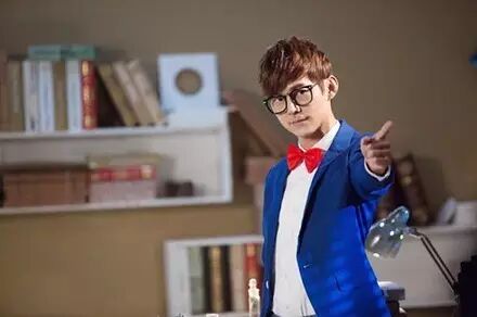 何炅变身名侦探柯南,蓝色西装配红色领结,加上黑框眼镜的点缀,十分惹眼。