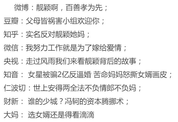 张靓颖的妈妈一出来控诉冯轲,很多人就想起了张韶涵的妈妈,当初她也是上媒体指责张韶涵弃养父母、吸毒,导致女儿的演艺事业一落千丈。当然,张韶涵的妈妈这种奇葩行为,和张靓颖的妈妈并不是一回事。但导致的结果可能一样:女儿的公众形象大受打击。现在张靓颖处于一个非常尴尬的境地:继续结婚?显得不孝、蠢;终止结婚计划?似乎又验证了妈妈和网友的怀疑都是对的,还是蠢。