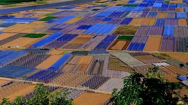 沿着村里小路,放眼望去,五彩斑澜的蔬菜大棚钢架就像那平静的彩色海幕涌向远处......